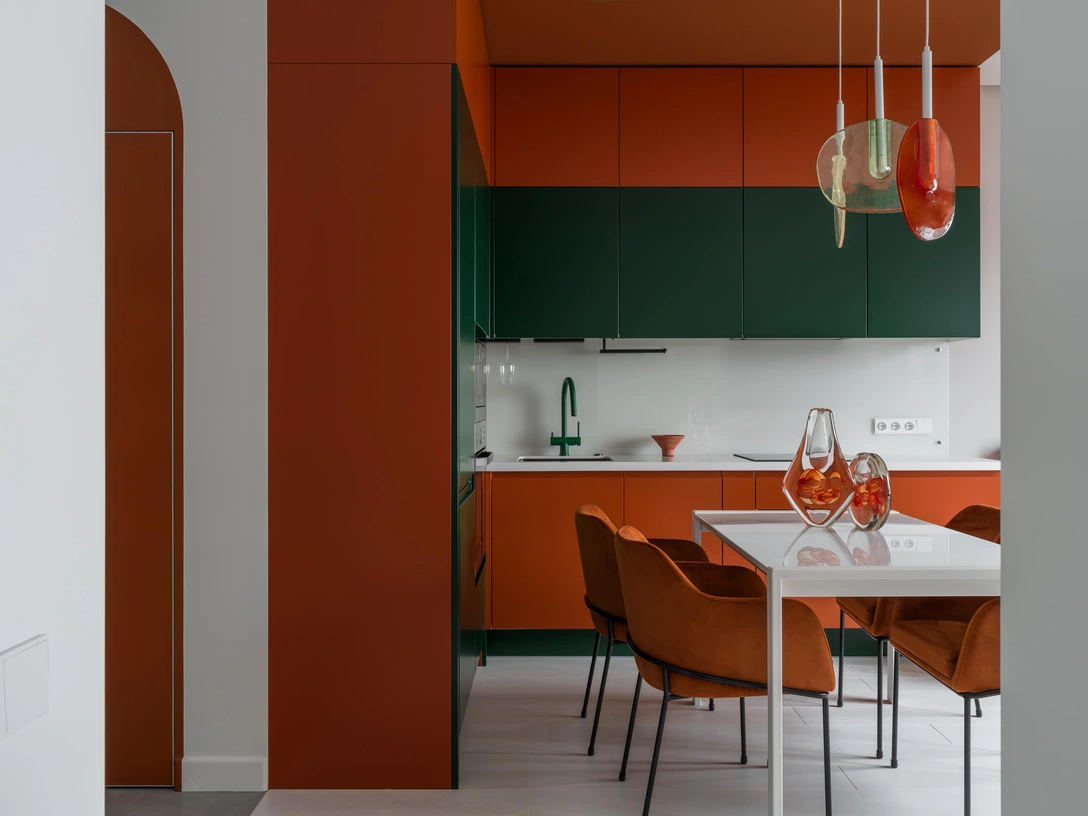 Концепция интерьера стоится на сочетании глубокого оранжевого и темно-зеленого. Палитра была выбрана не случайно: оранжевый символизирует смелость и движение вперед, а зеленый — уверенность и устойчивость. Оттенки появляются в виде цветовых блоков и акцентов на стенах и мебели, задавая тон всему пространству.