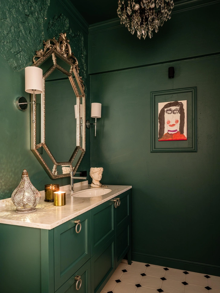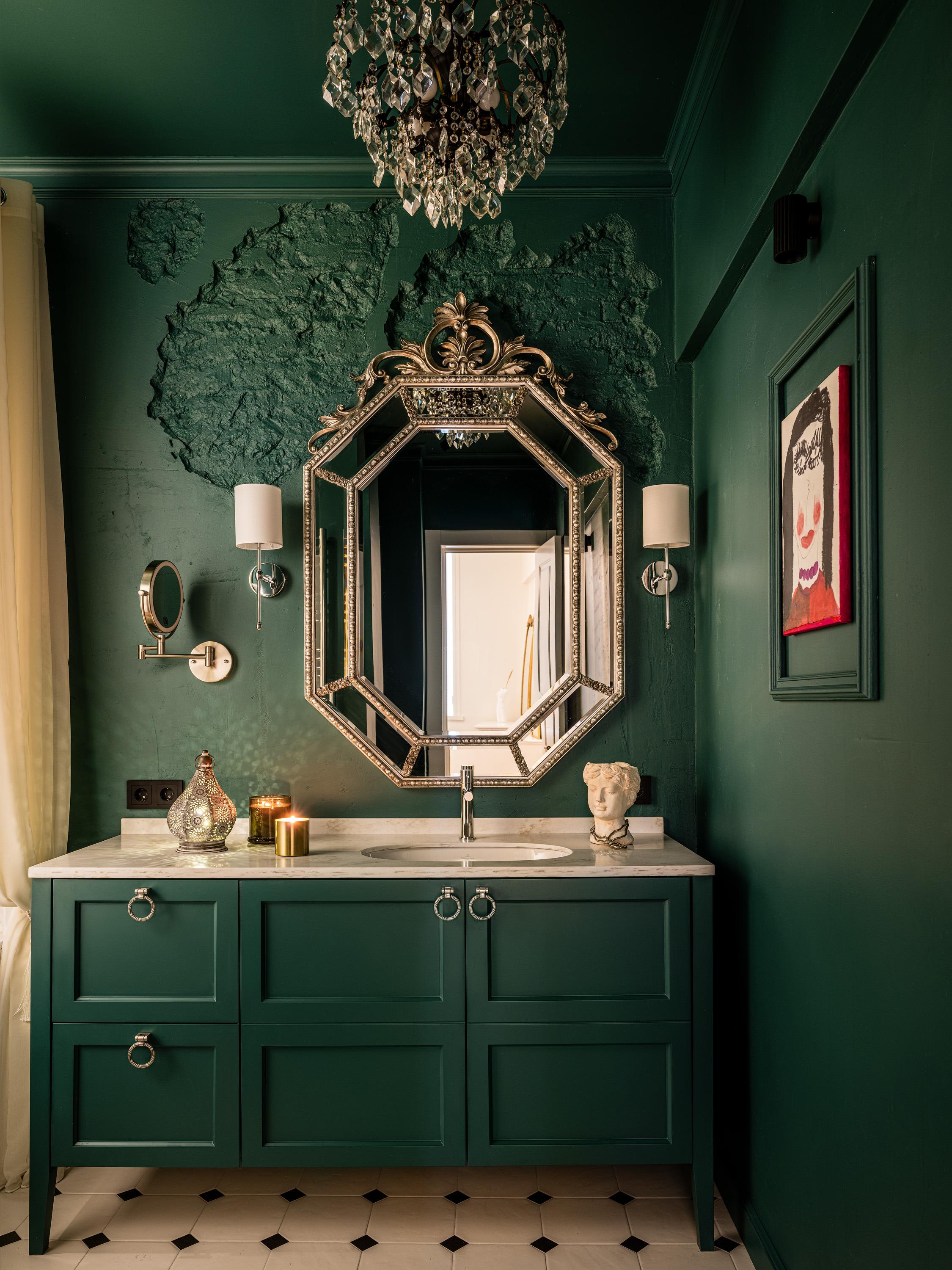 Ванная комната — отдельная любовь. Проступающий родной кирпич вокруг помпезного зеркала, детcкий рисунок хозяйки, покрашенные в такой же цвет как и потолок кухни стены, потолок и мебель — производит впечатление «малахитовой шкатулки». Это самое дальнее помещение в квартире, куда можно попасть, пройдя через все комнаты. И как полагается в хорошем сценарии к фильму, оно эффектно завершает впечатление о квартире.