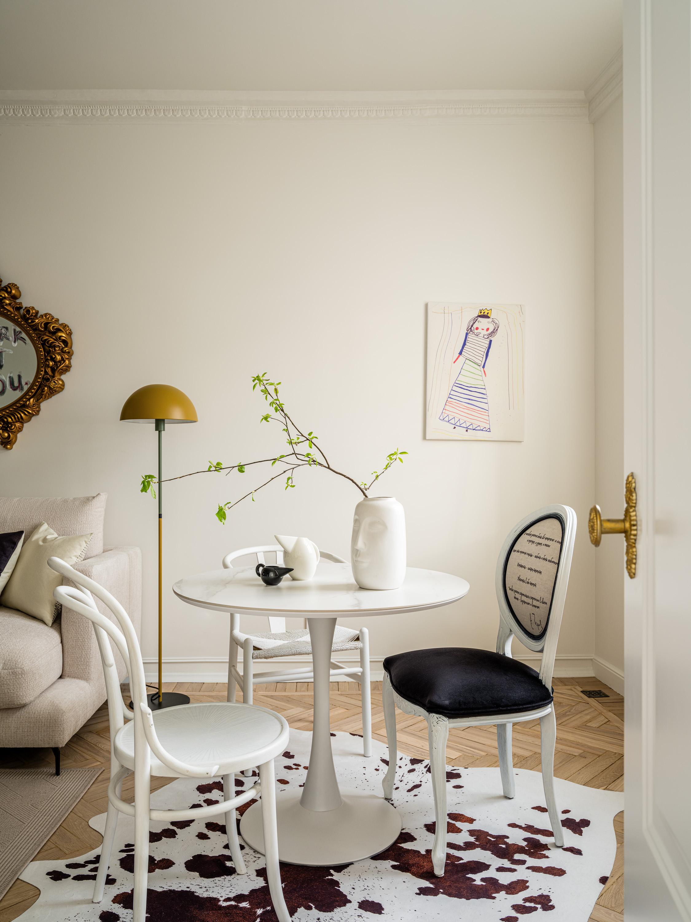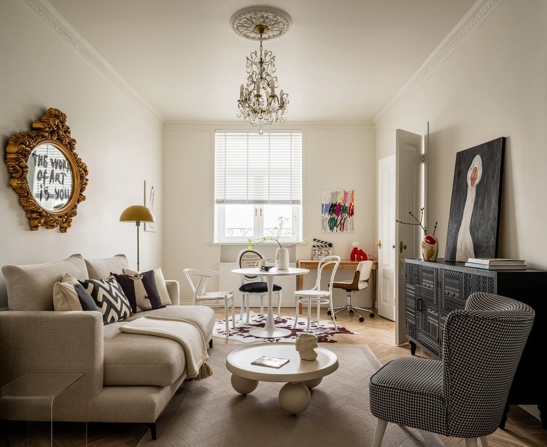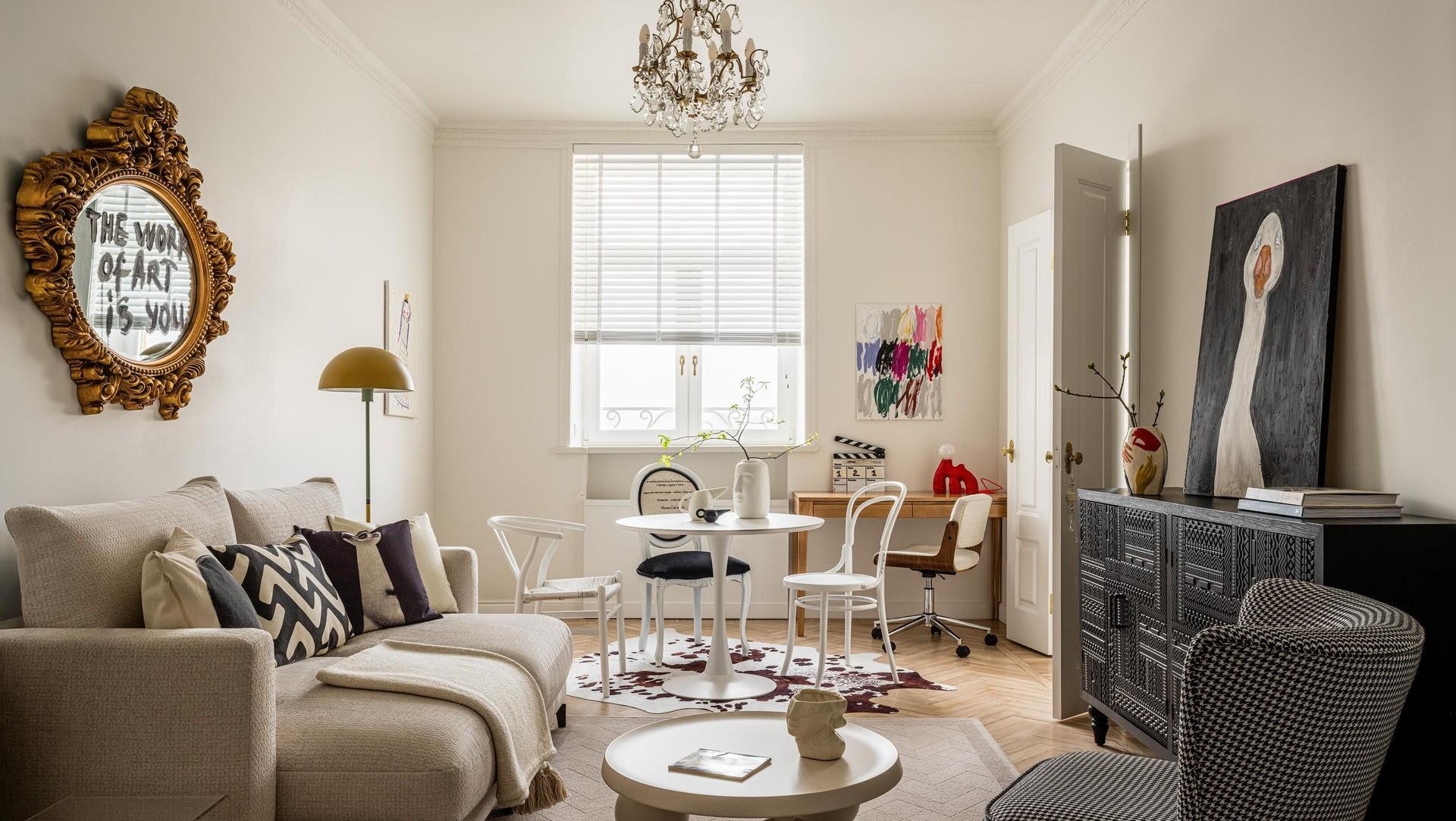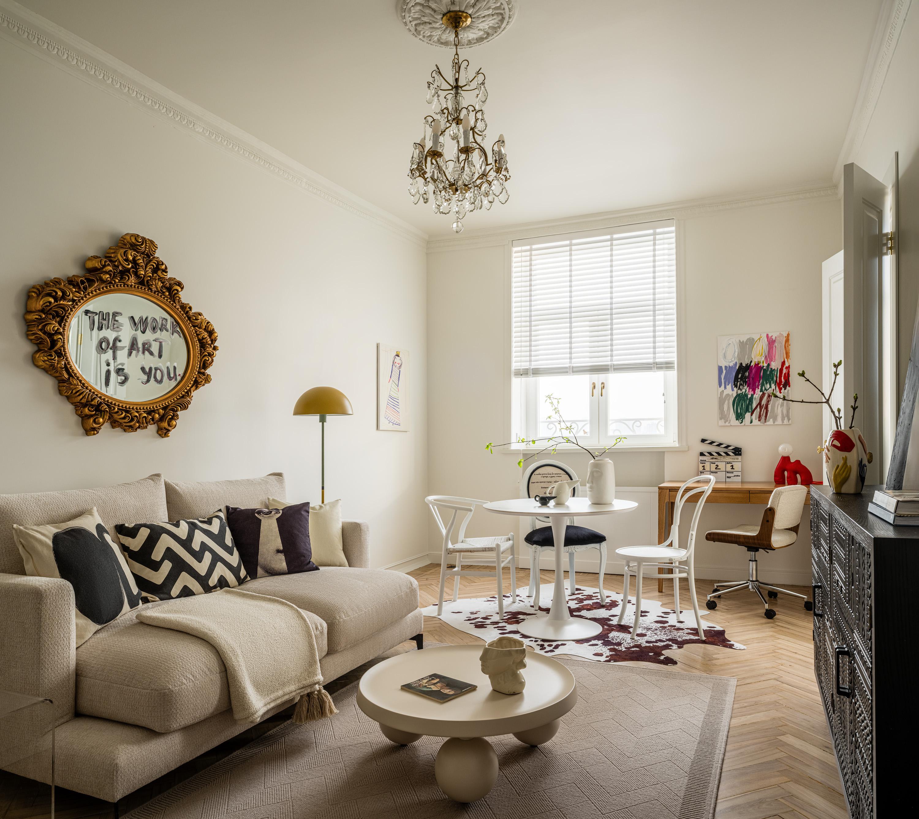 В интерьерах соединили элементы классики и современность, добавили немного китча и юмора. Так, вместо постеров напечали на холсте детские рисунки хозяйки, придав историческому «пафосу» сталинки несерьезность. На зеркале в гостиной написали краской «The Work 0f Art is You», что означает «Ты сам — произведение искусства».
