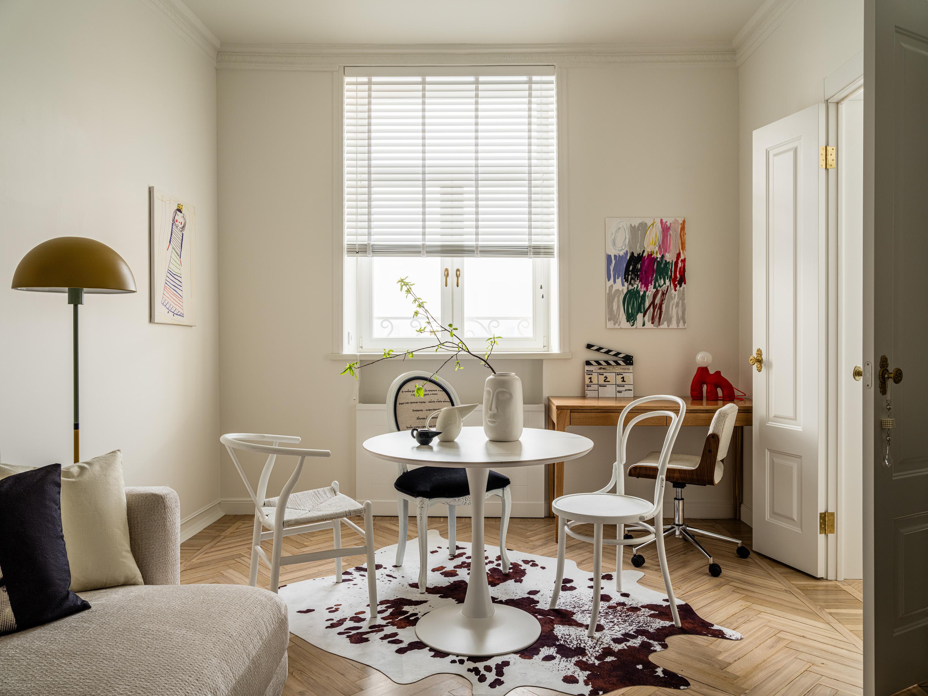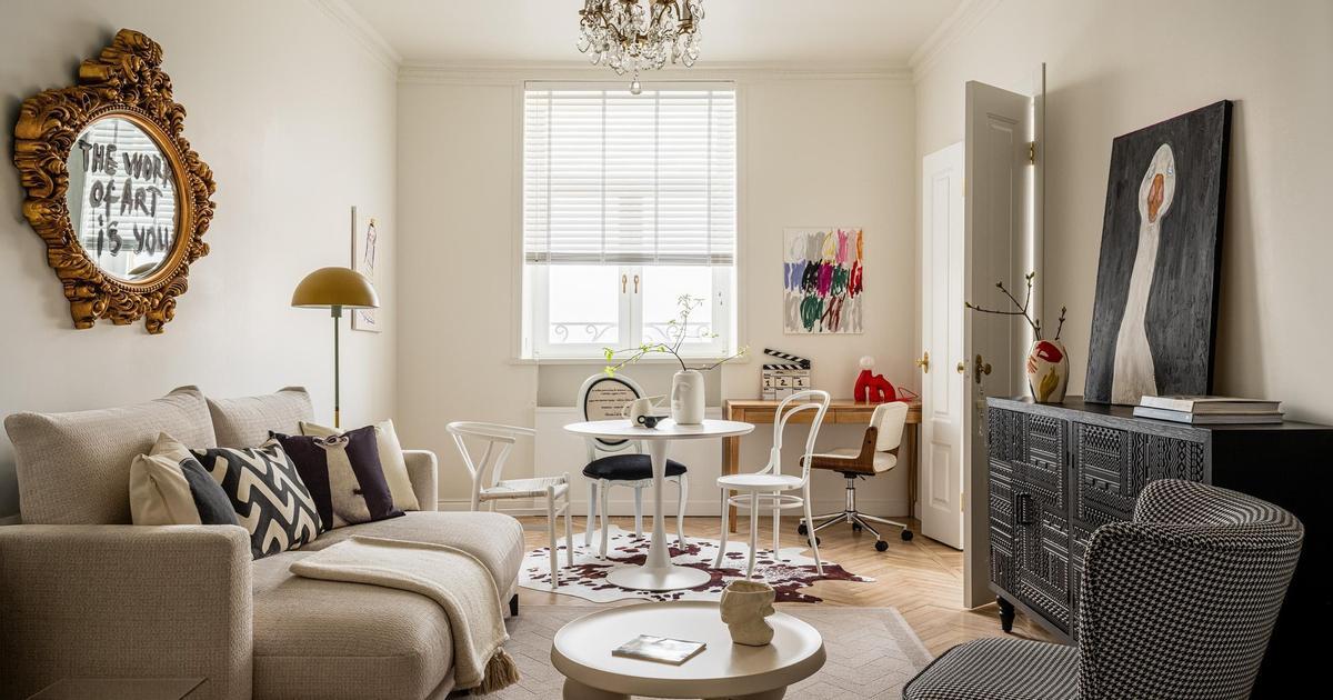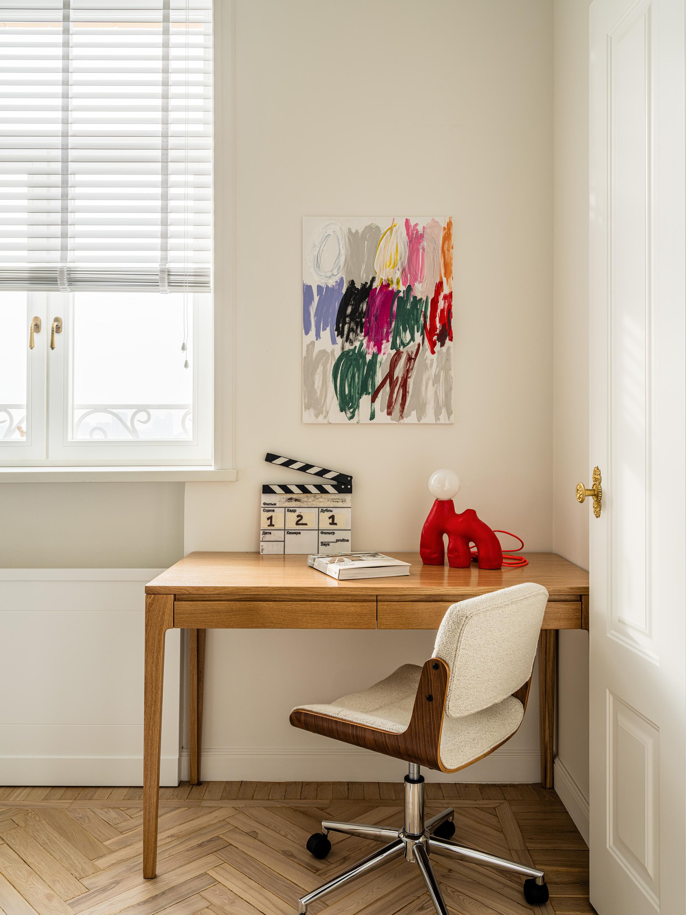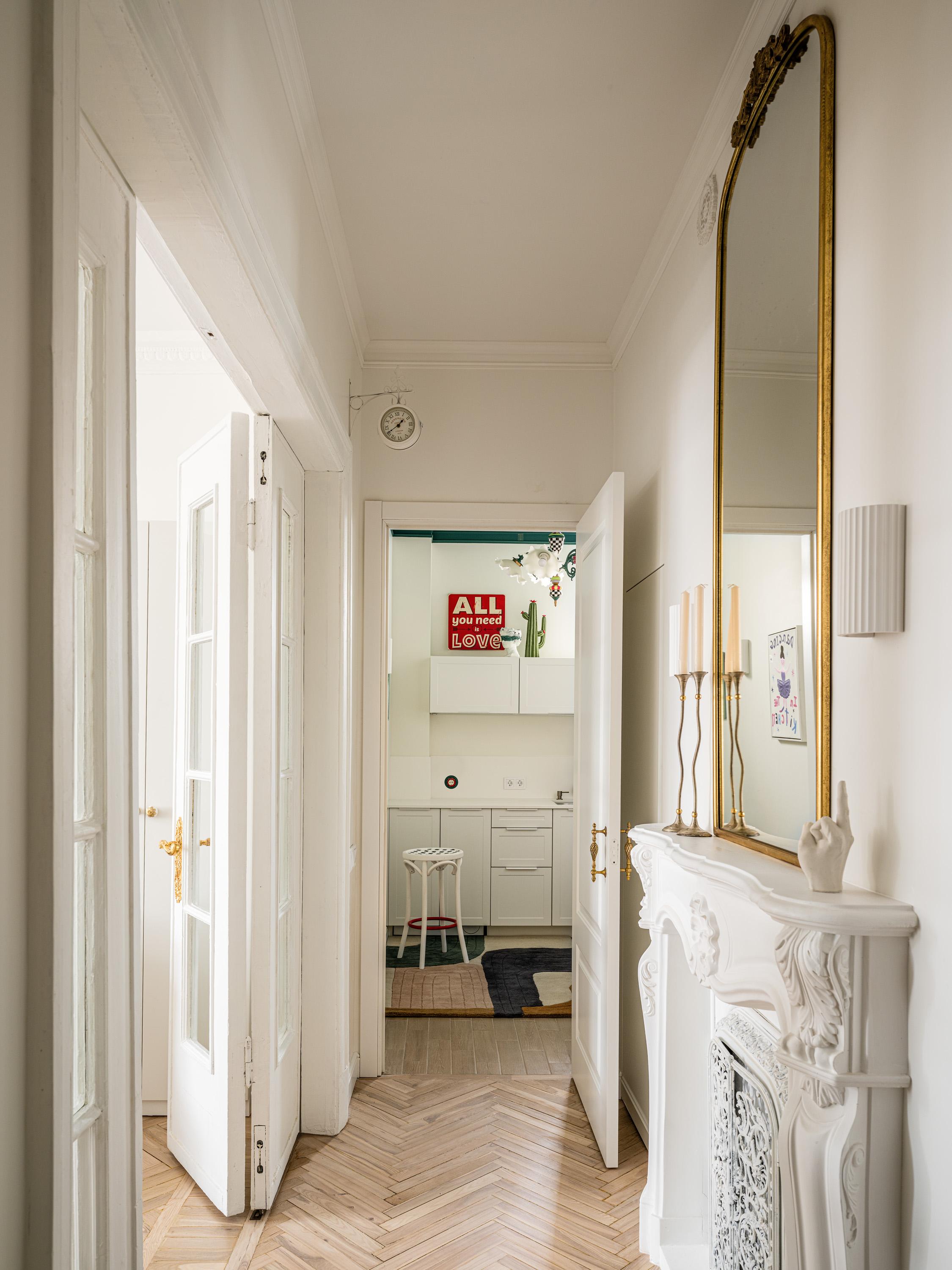 В интерьерах соединили элементы классики и современность, добавили немного китча и юмора. Так, вместо постеров напечали на холсте детские рисунки хозяйки, придав историческому «пафосу» сталинки несерьезность. На зеркале в гостиной написали краской «The Work 0f Art is You», что означает «Ты сам — произведение искусства».