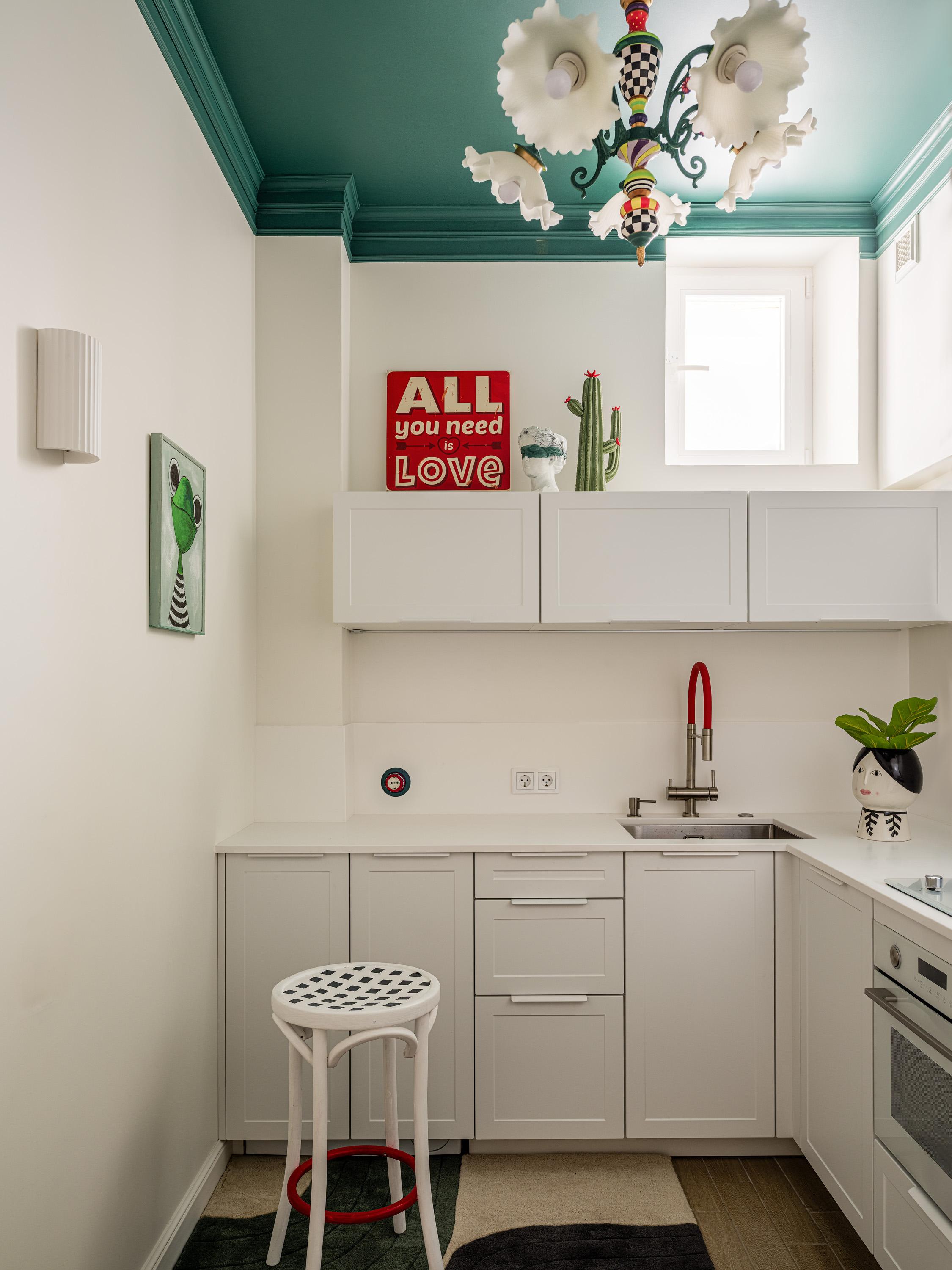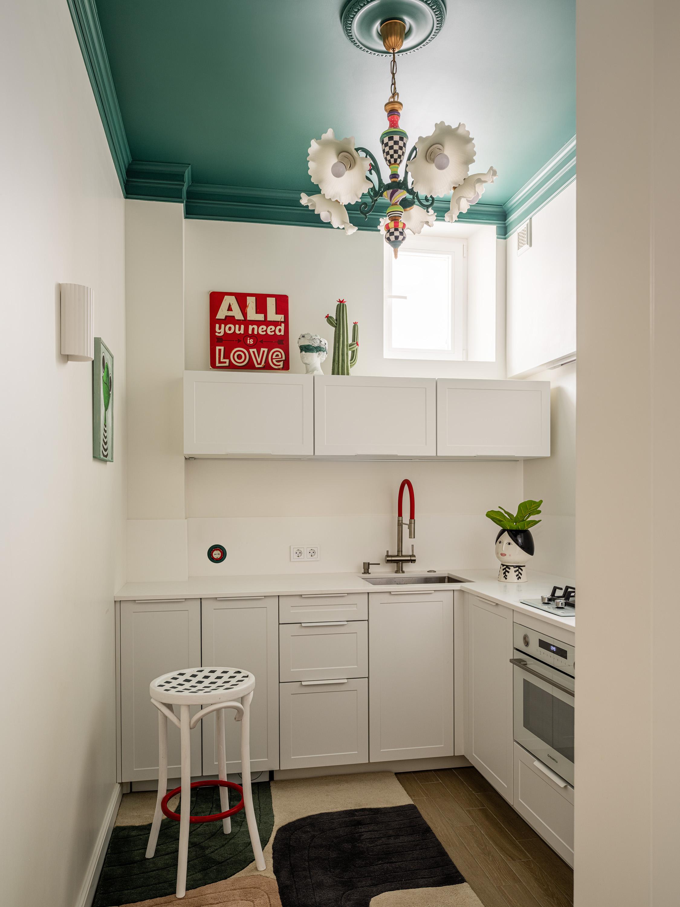 На кухне «плясали» от люстры, которую приобрела заказчица в начале ремонта — советский светильник расписан вручную в стиле MacKenzie Chileds. Так в проекте появился изумрудный потолок, на фоне которого люстра заиграла еще больше. Детали и декор подбирались под светильник, а скучная кухня своеобразной формы превратилась в интересное пространство.
