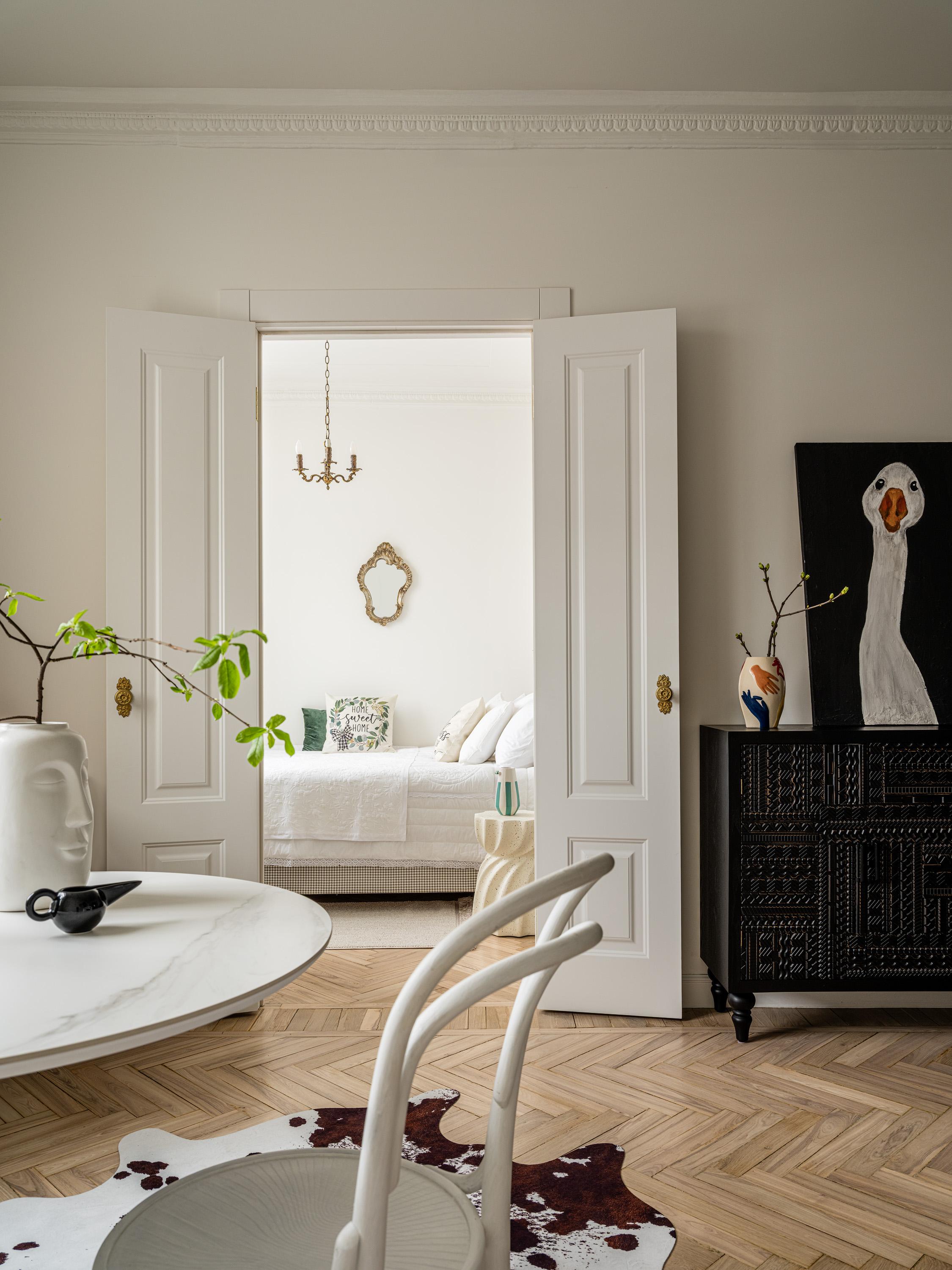 Самый необычный предмет в этом интерьере — детские рисунки хозяйки квартиры. Мы думали, что же повесить на стены. И нам пришла идея распечатать на холсте и натянуть на подрамники детские рисунки. Часть картин в квартире нарисованы мной, в том числе с гусем.