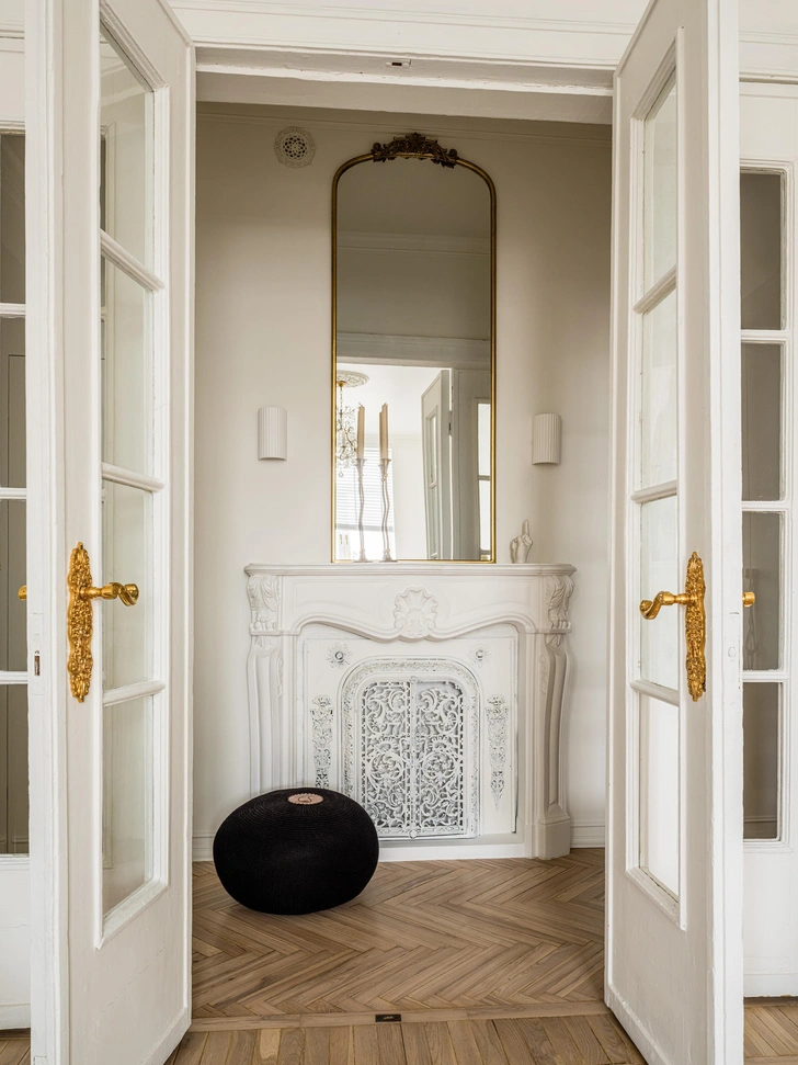 Оригинальные тяжелые распашные двери и входную дверь 1953 года сохранили — артефакты, которые создают атмосферу. Придумался камин в холле, а к нему нашли антикварную дверцу со следами времени.