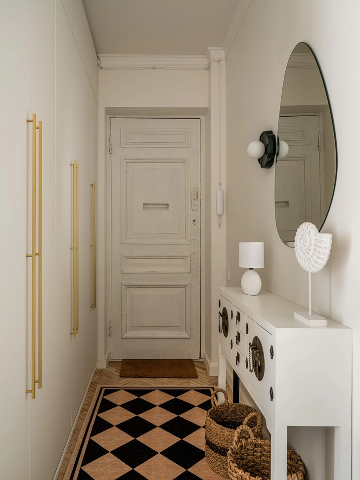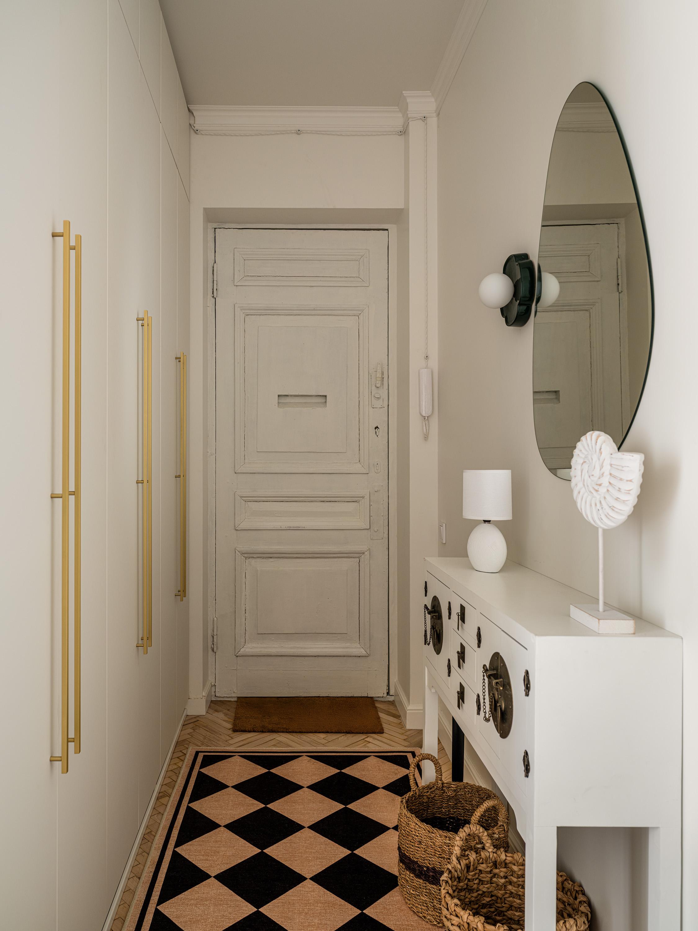 В прихожей совместили хранение до потолка с эффектными деталями. Шкафы, «Лемана Про». Ручки «Брасс». Зеркало сделано на заказ.