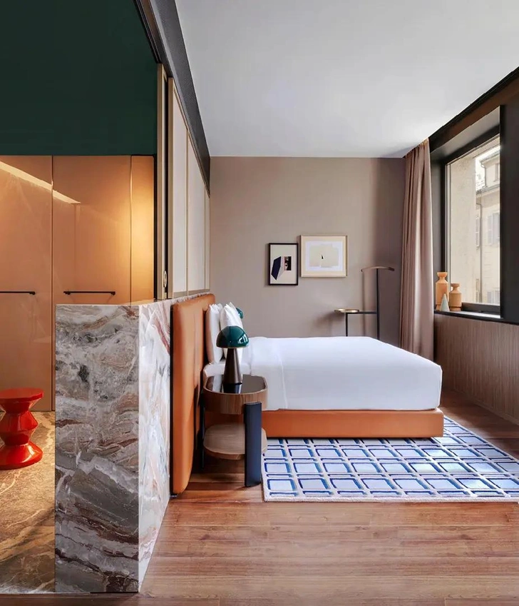 Этот отель расположился в Porte Nuova — Garibaldi — Corso Como, модном и деловом районе. Дизайнеры студии Vudafieri-Saverino Partners стремились создать небанальное пространство, открытое городу. Вдохновлялась команда самим Миланом, его ритмом и архитектурным обликом. В интерьерах читаются переосмысленные идеи знаменитых миланских мастеров.