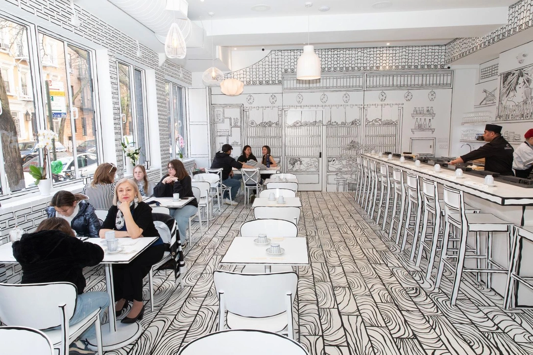 Ресторан Shirokuro в Нью-Йорке выглядит как скетчбук, а его посетители чувствуют себя героями мультфильма или книжных иллюстраций. Все детали интерьера нарисованы художницей Мирим Ю. За три месяца она расписала пространство и мебель ресторана — от многочисленных «деталей» на стенах до столиков и стульев.