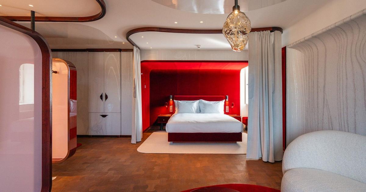 Самый большой номер — Suite des Rois площадью 240 квадратных метров. Это анфилада комнат вдоль фасада. Пространство открытое: спальню от ванной отделяют только приподнятые встроенные конструкции и тяжелые юархатные шторы.