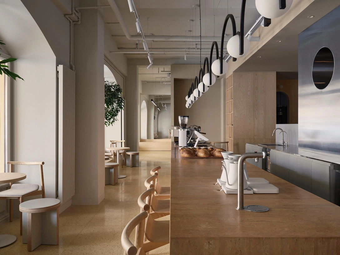 Пространство разделили на две зоны массивным островом из травертина. Вдоль арочных окон разместили светлую «быструю» зону для тех, кто берет кофе с собой или перекусывает. В глубине за островом находится «медленная» зона со столиками для полноценных обедов и тех, кто никуда не спешит.