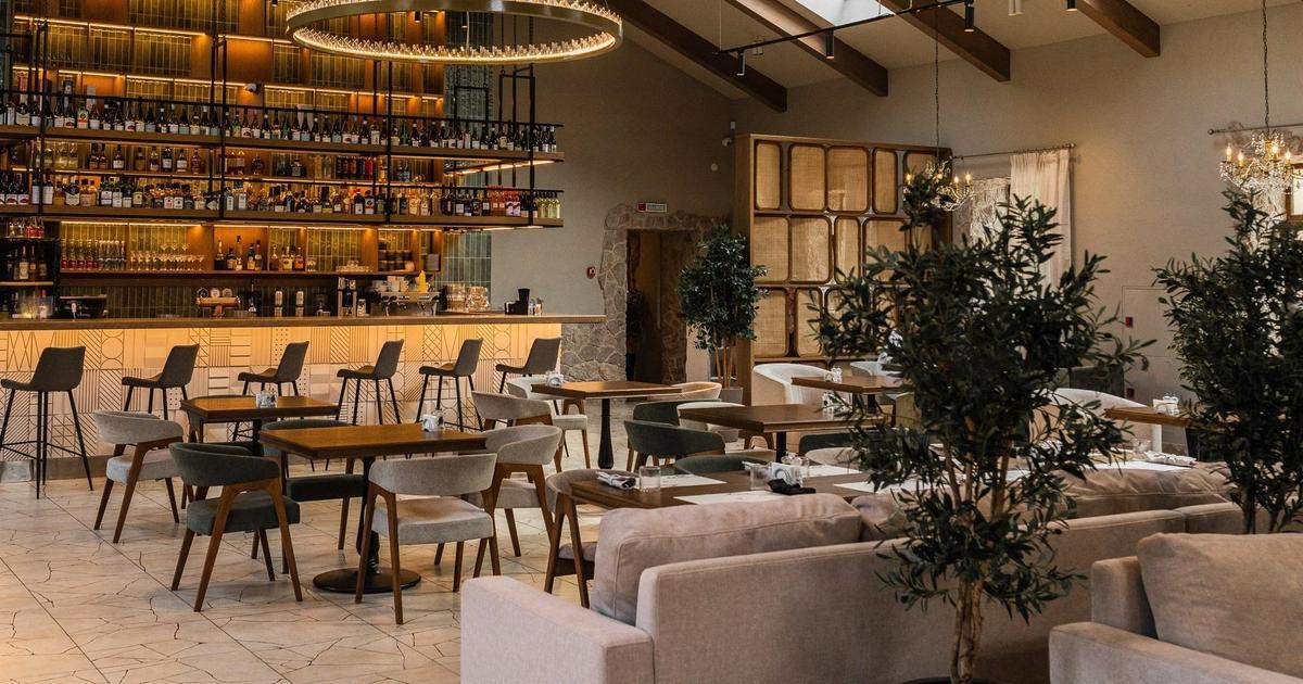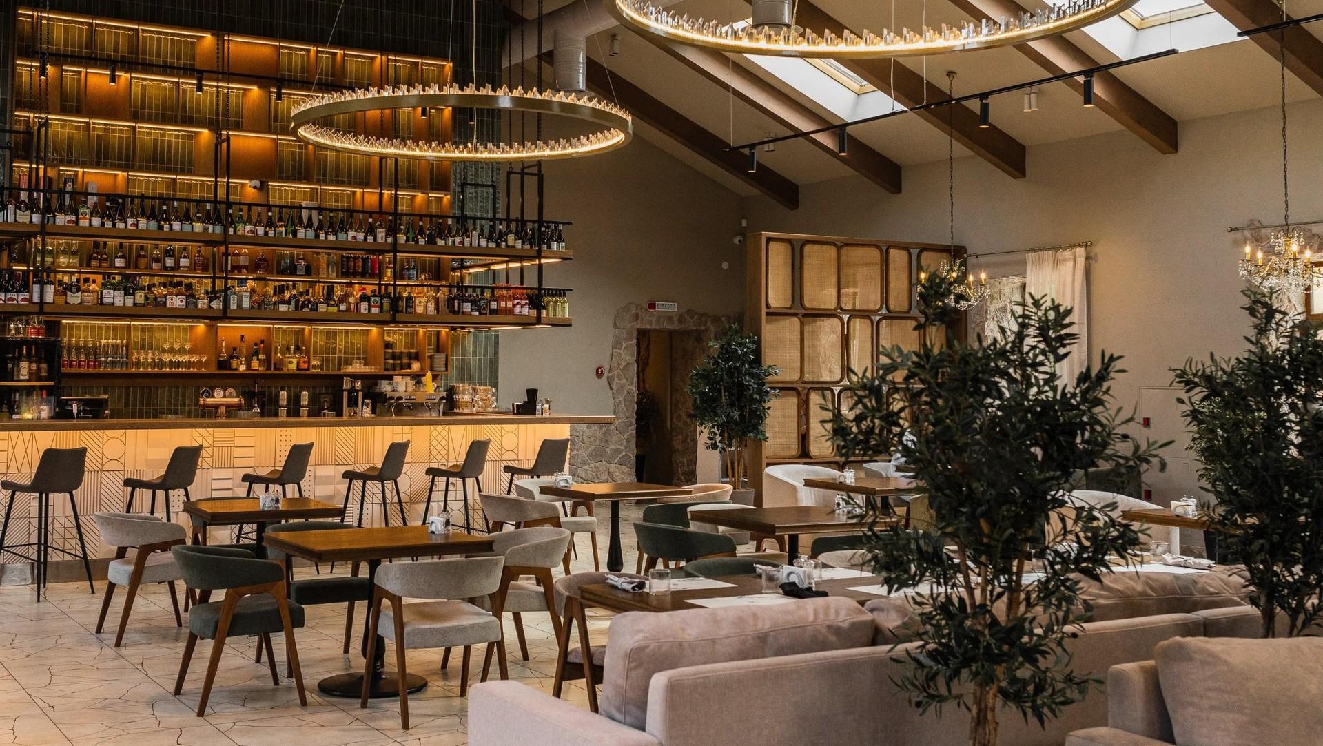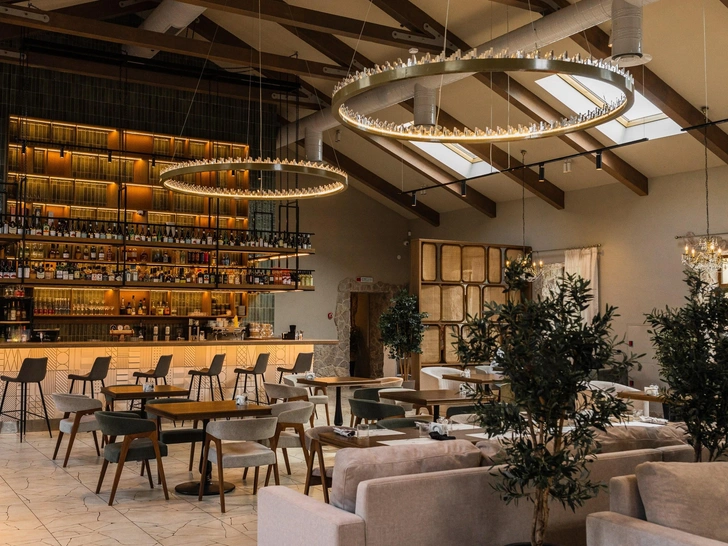 Барная зона решена через фактуру — рельефная гипсовая плитка перекликается с историческими поверхностями и работает как акцент, не выбиваясь из общего контекста. Открытые балки оставили видимыми: они задают ритм и подчеркивают структуру пространства.