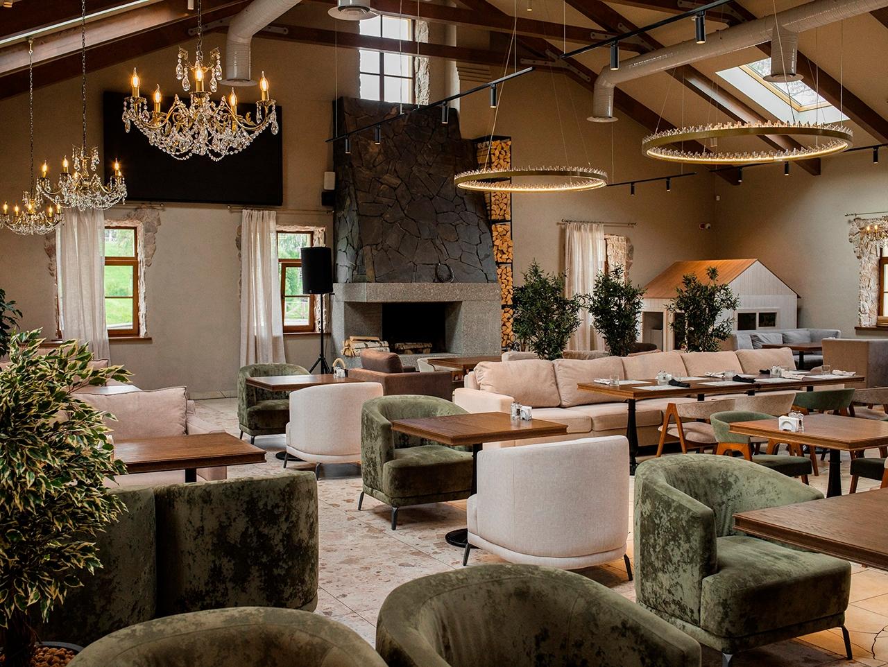 Центром ресторанного зала стал камин. У него была сложная асимметричная форма, усиленная скатным потолком, поэтому дизайнеры решили выровнять ее геометрией: появился объемный короб с отделкой темным камнем, светлый портал и высокая дровница, которая «собирает» композицию.
