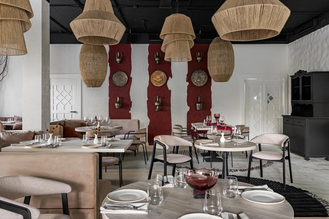 Аутентичность подчеркивается и сложной геометрией: симметричные ряды черных глянцевых бутылок в арочных нишах, свободно расставленные столики разных форм и размеров, ковры, будто наскоро разрезанные на произвольные фрагменты. К слову, ковры играют здесь одну из ключевых ролей — объемные текстуры, сильные темные оттенки, бахрома и орнаменты зонируют пространство и добавляют ему тактильной глубины.