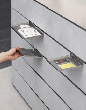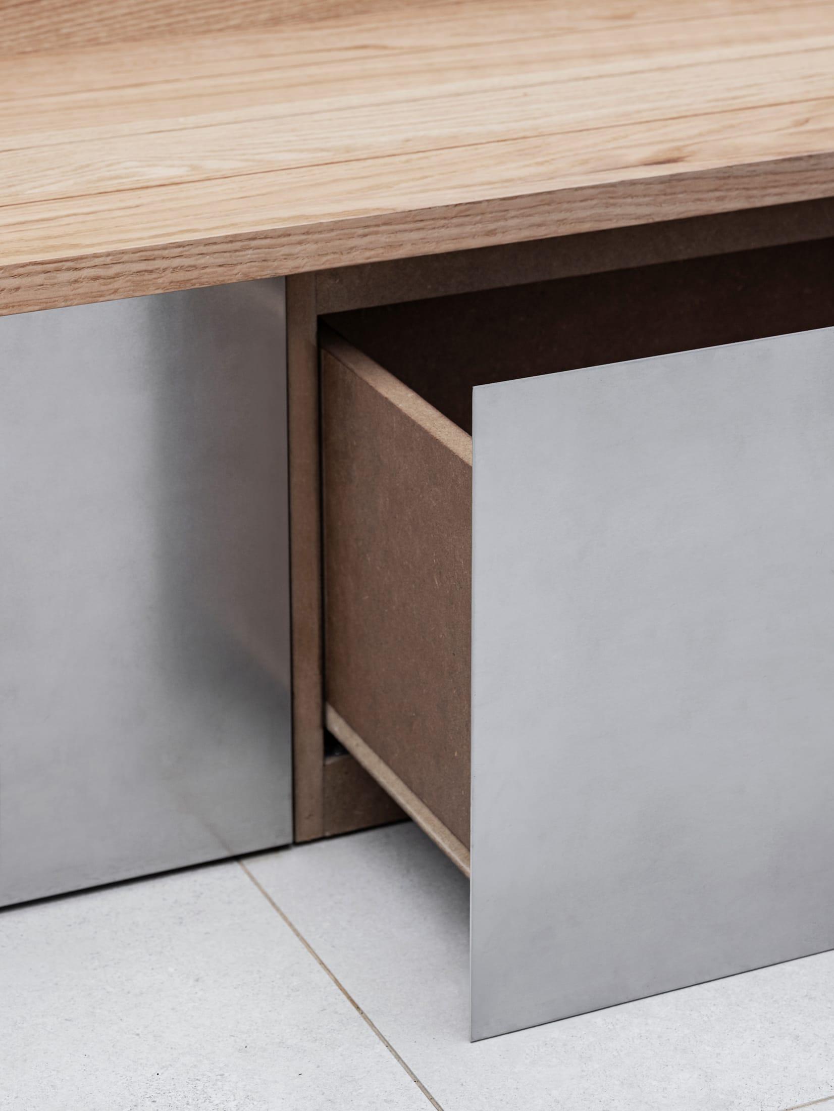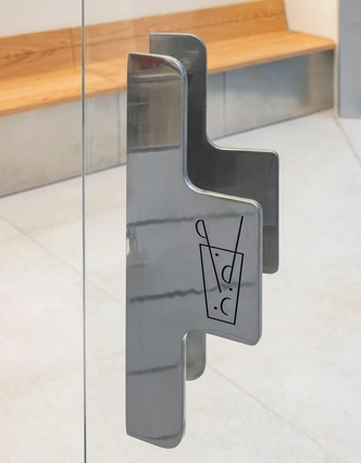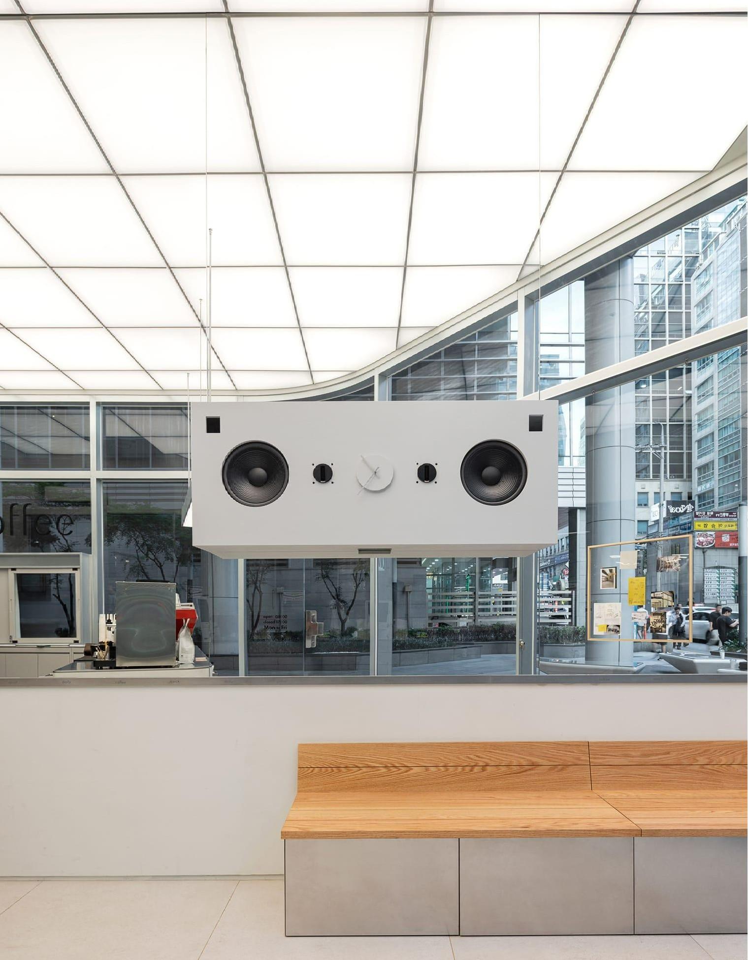 Главное в этом проекте — детали. Шкафы для хранения сделаны так, что напоминают переговорные с опущенными жалюзи: они мягко светятся, будто внутри идет совещание. Ручки имеют форму канцелярских скрепок. В стойку встроены системы хранения, напоминающие офисные стеллажи. Над зеркалом висят часы, которые одновременно работают как колонка — зеркальная поверхность усиливает ощущение, что они парят в воздухе.