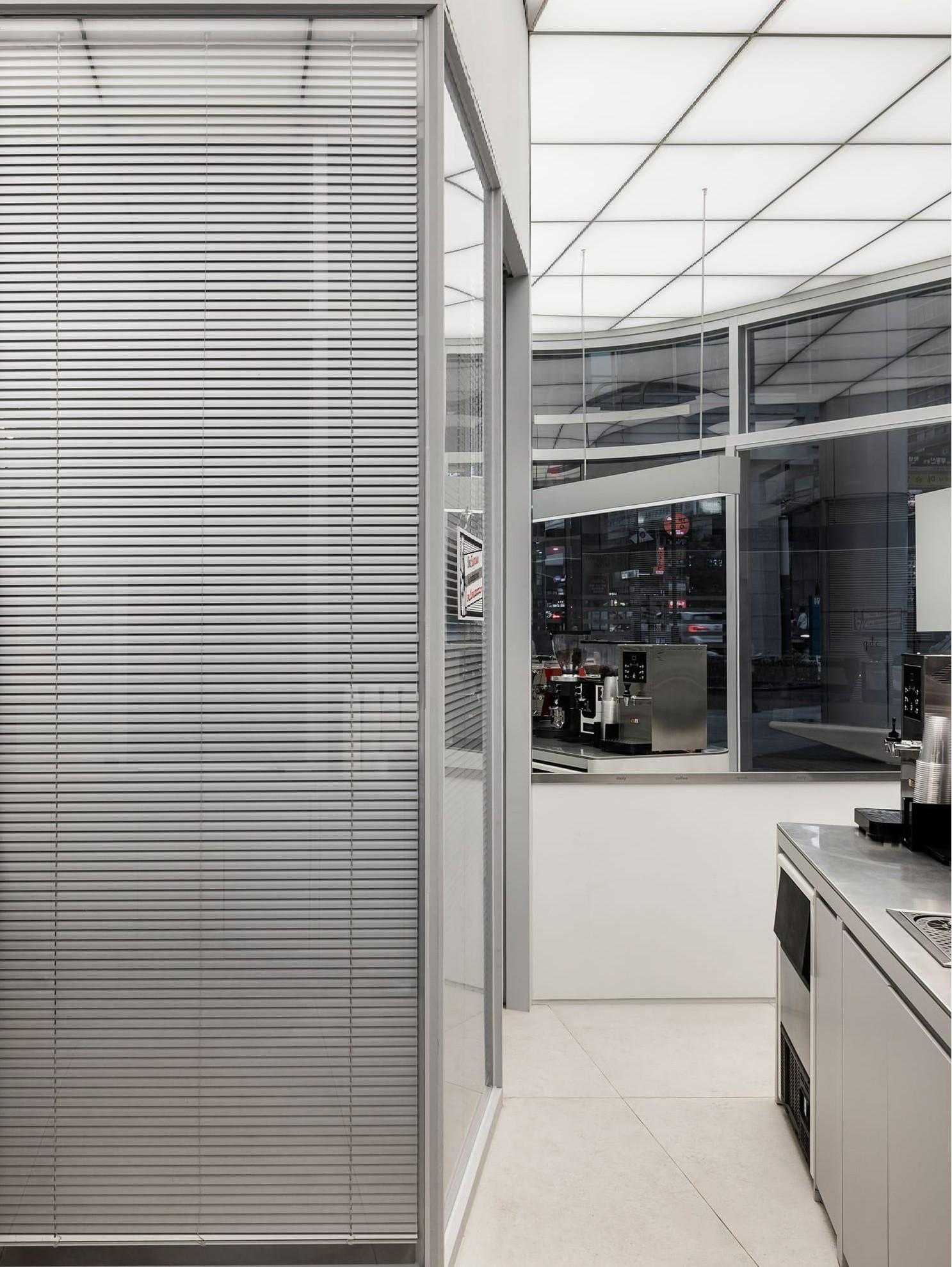 Фасад кафе сделан из алюминия. Архитекторы опустили рамы до уровня земли, чтобы смягчить присутствие здания на улице светом и отражениями. Каждую раму сделали с закругленными краями — это придает угловому участку более мягкий, дружелюбный вид.