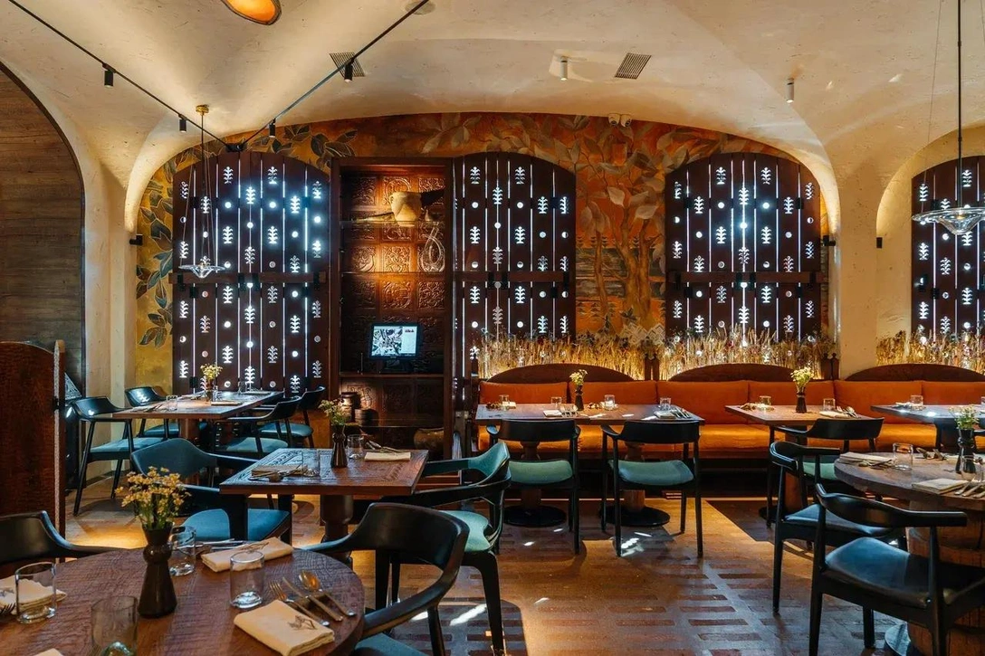 Оштукатуренные арочные своды, камерный свет и фрески напоминают об архитектуре русских монастырей. Одна из настенных росписей повторяет фреску «Жатва» из ярославского храма Ильи-пророка. Фрески для ресторана создала художница Елена Клокова.