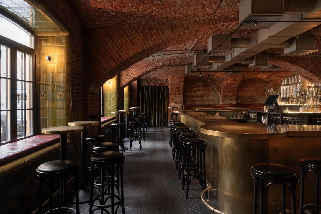 Мы погрузились в культуру Серебряного века, исследовали черты эпохи, чтобы адаптировать их для интерьера современного бара. За основу мы взяли характерные тому времени материалы — обожженное дерево, клинкерный кирпич, керамическую плитку, шенилл, чугун и латунь. Мы провели ребрендинг, но в то же время оставили некоторые давно полюбившиеся гостям черты.
