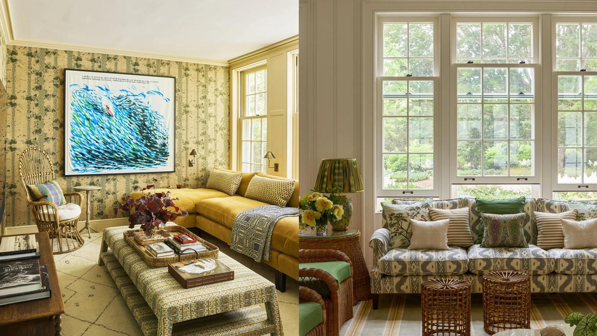 Обои Japón Garden, Michael S. Smith для Hartmann & Forbes. Диван в ткани Charlton от Tissus d’Hélène, Rita Konig. Оттоманка с обивкой Jasper’s Jamu, Turner Pocock для Lorfords. Берберский ковер, Luke Irwin. Картина, Raymond Pettibon.