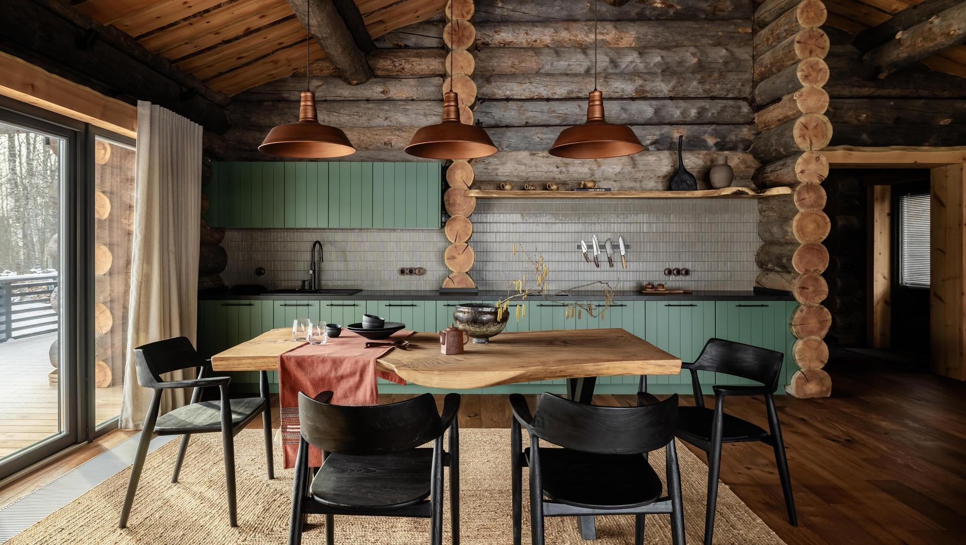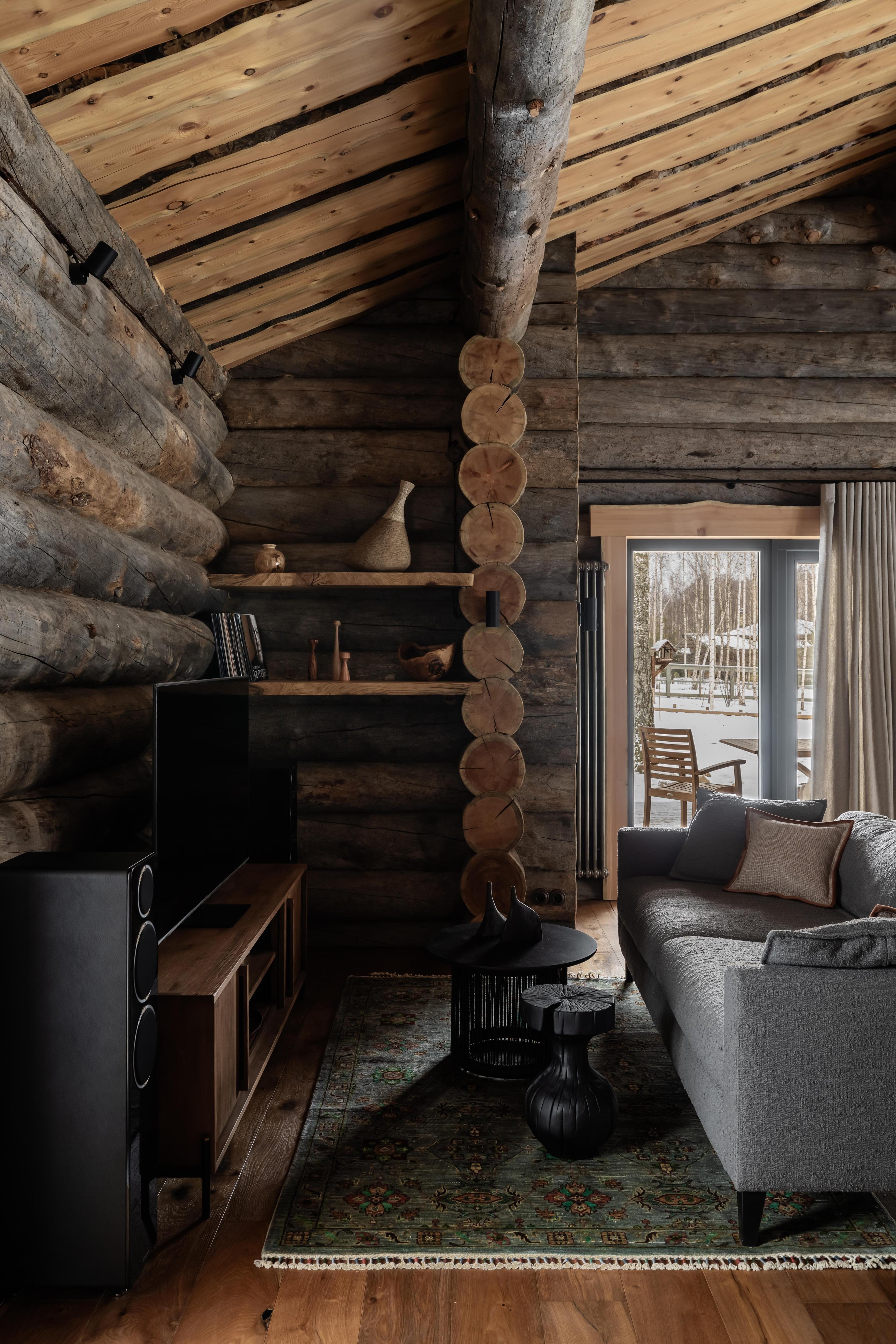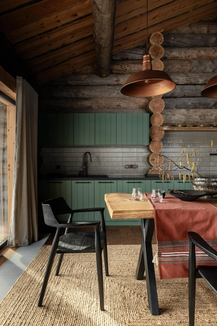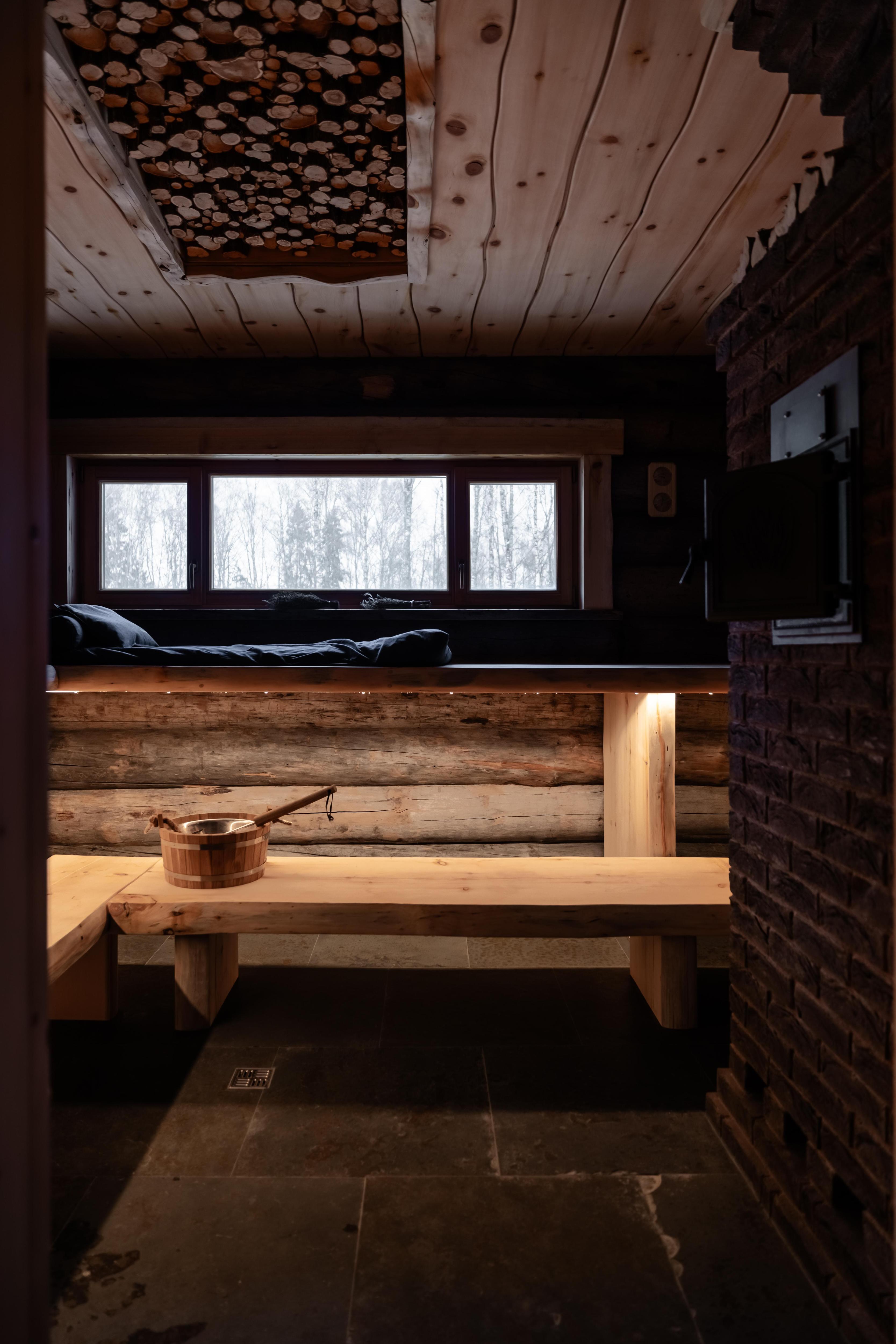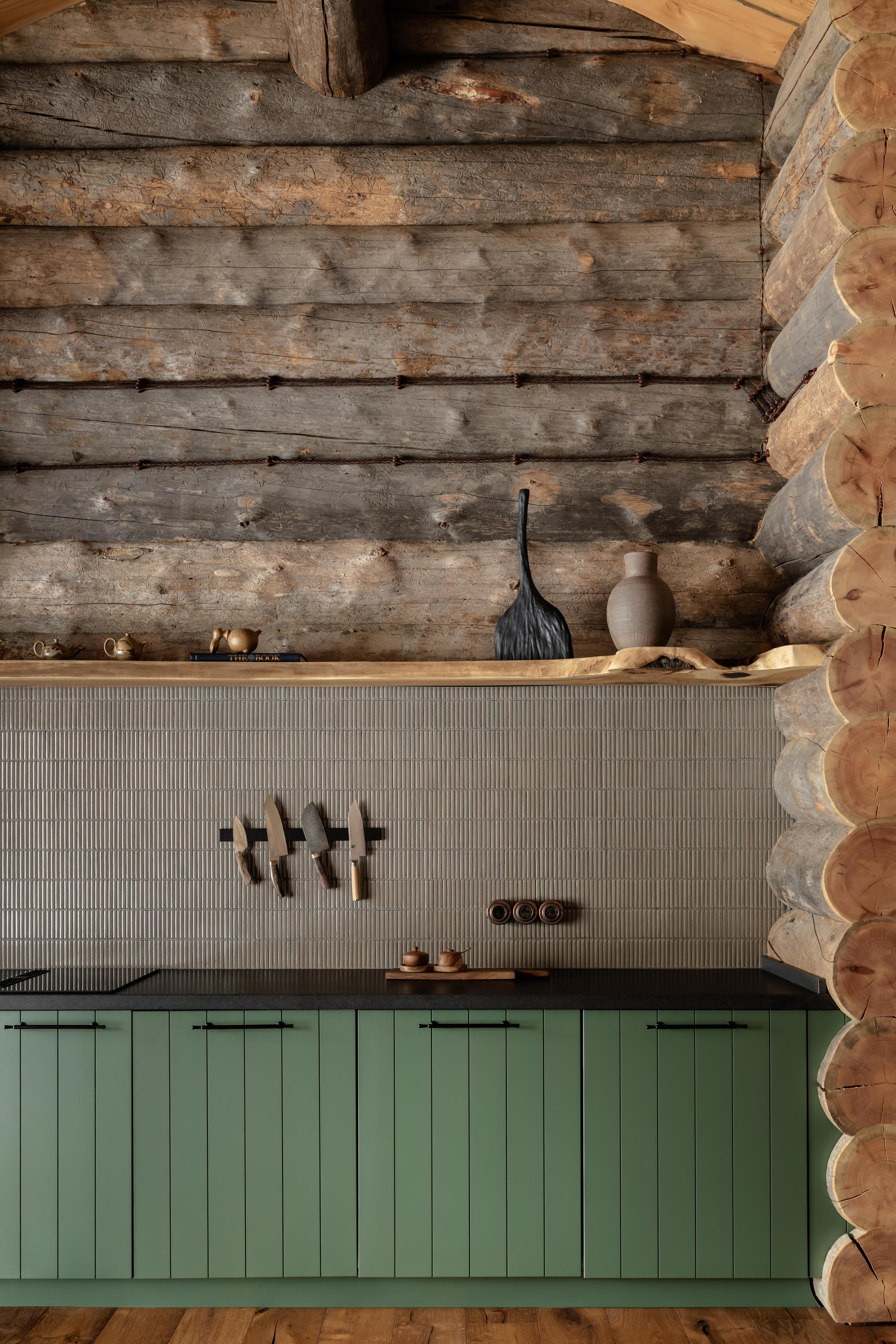 Мы работали над банным домом, построенном из сухостойной сосны кело, он находится на участке рядом с основным. Его обрамляет большая терраса с печью, внутри — парная, спальня и кухня-гостиная. Хозяин очень любит дерево, поэтому в интерьере мы использовали массивы редких пород деревьев, которые он выбирал сам. Подчеркнуть красоту сосны кело благородного серебристо-серого цвета я хотела натуральными материалами и природными оттенками. Мы внесли зеленые акценты, смотрится свежо и в то же время ненавязчиво.