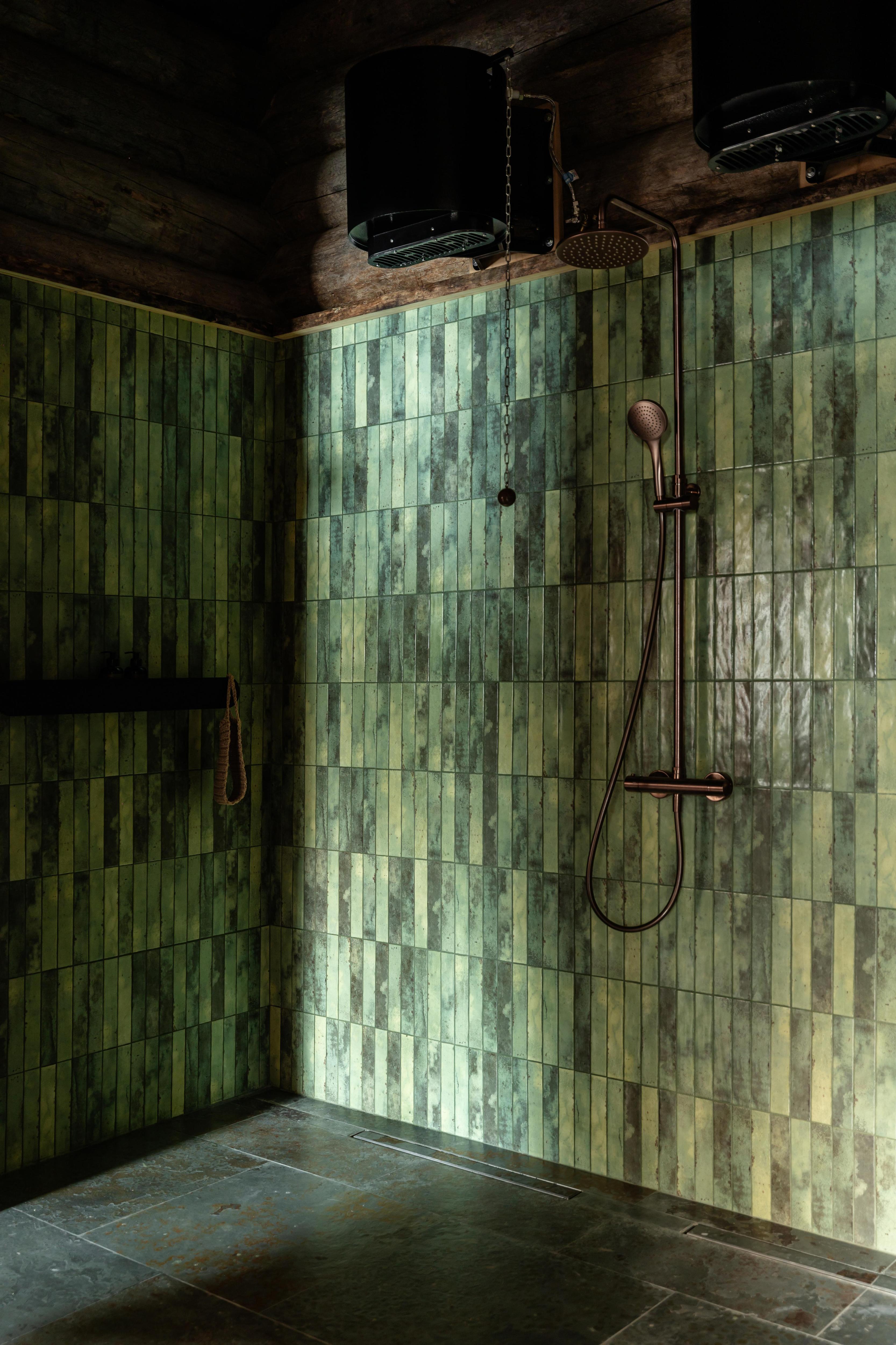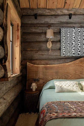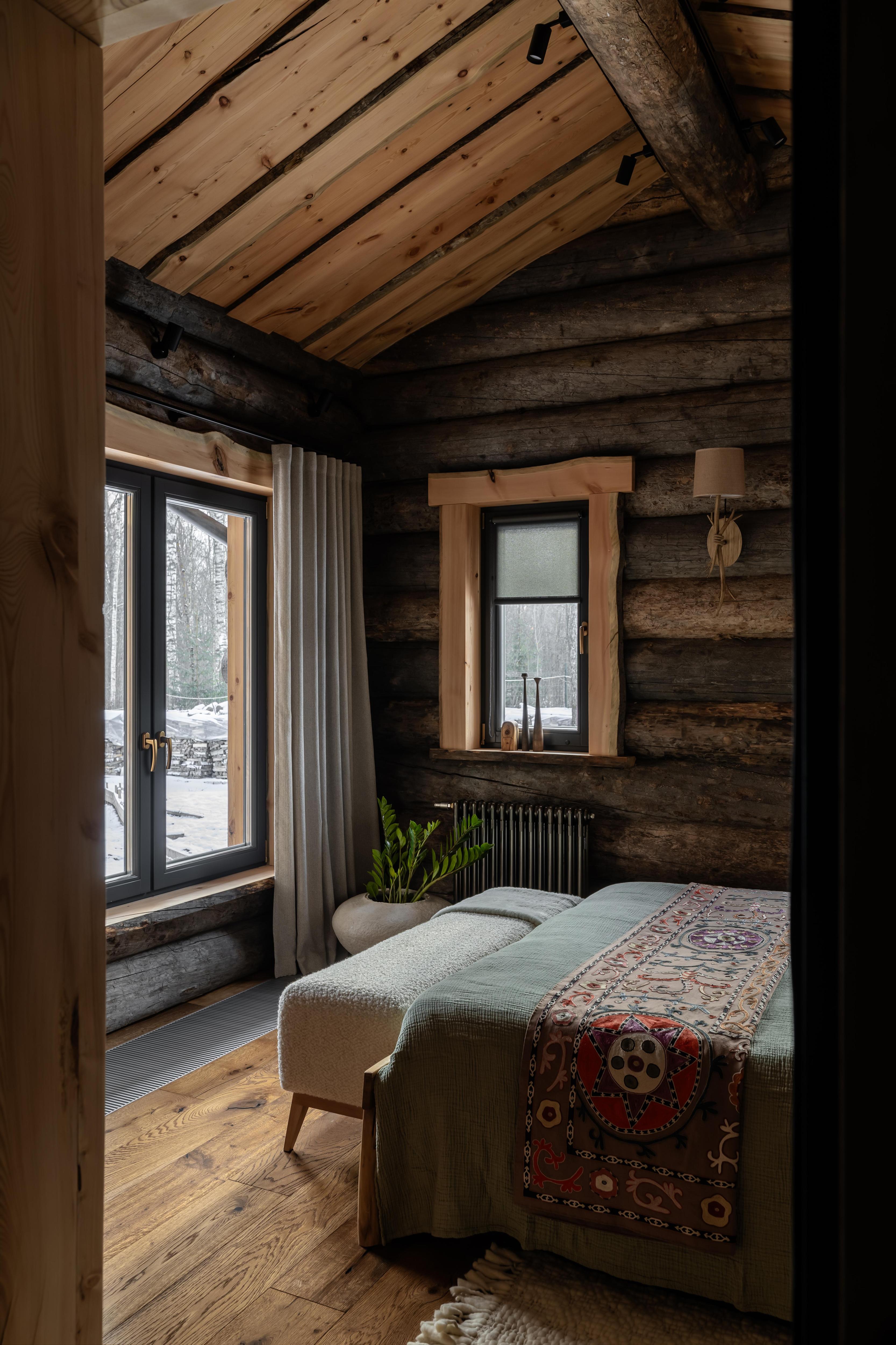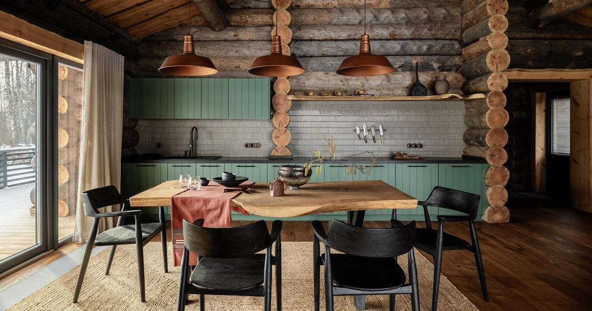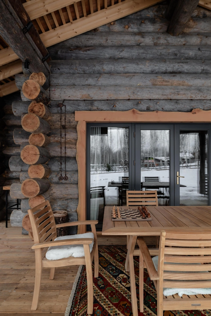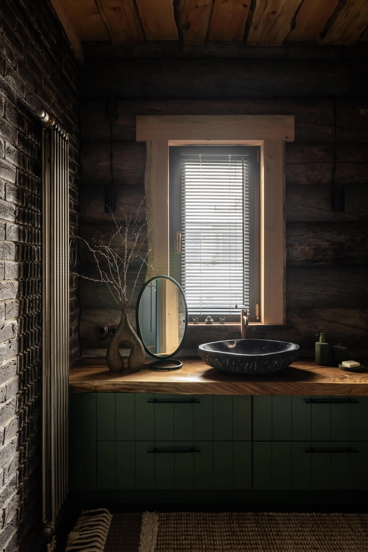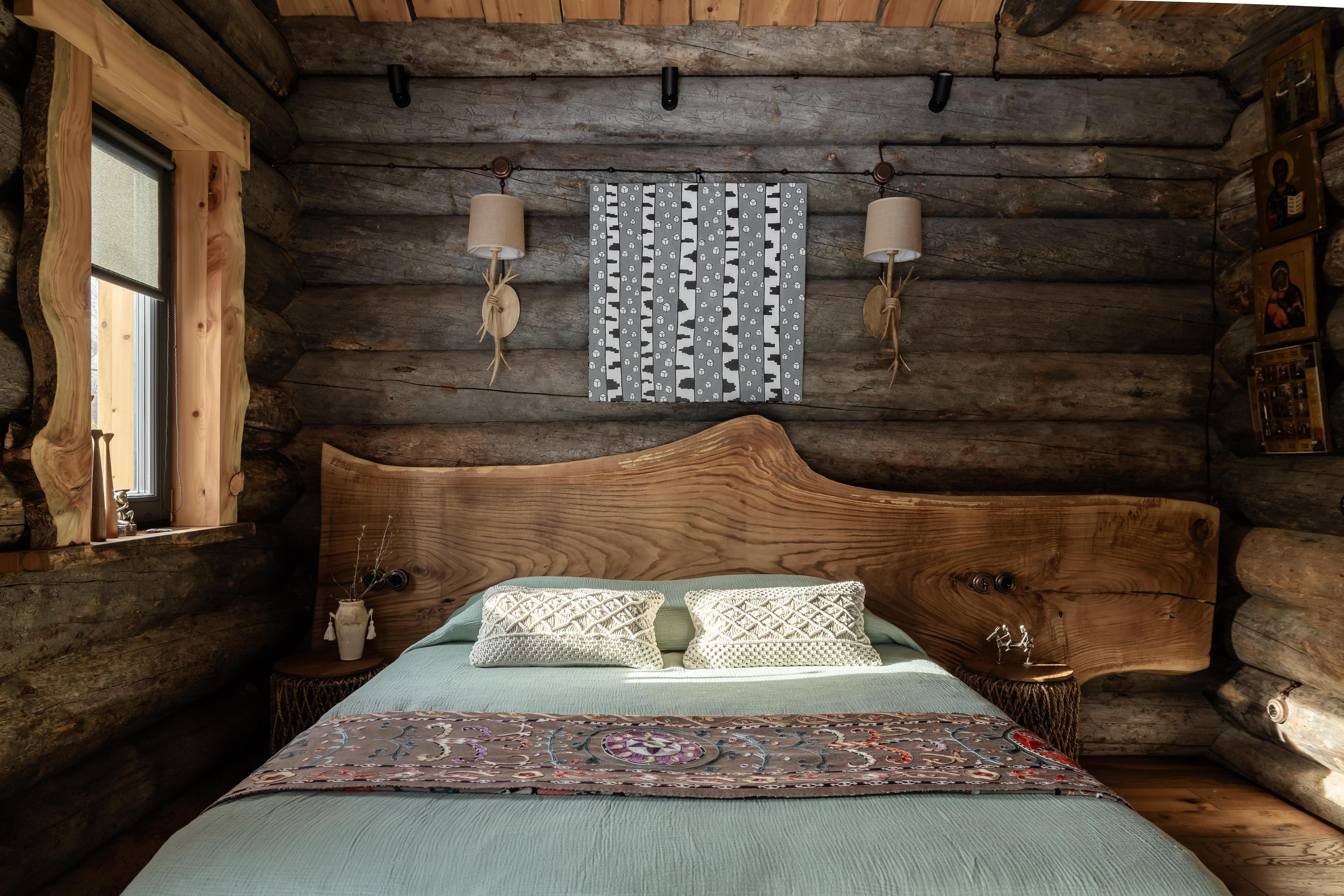 Мы работали над банным домом, построенном из сухостойной сосны кело, он находится на участке рядом с основным. Его обрамляет большая терраса с печью, внутри — парная, спальня и кухня-гостиная. Хозяин очень любит дерево, поэтому в интерьере мы использовали массивы редких пород деревьев, которые он выбирал сам. Подчеркнуть красоту сосны кело благородного серебристо-серого цвета я хотела натуральными материалами и природными оттенками. Мы внесли зеленые акценты, смотрится свежо и в то же время ненавязчиво.