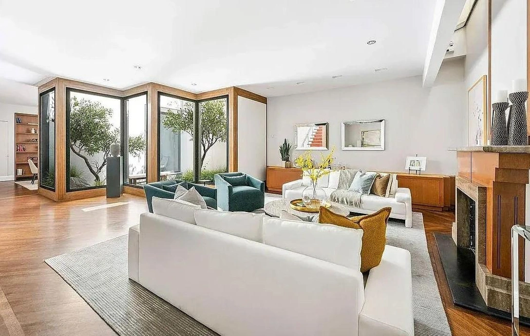 Среди особенностей дома — оригинальные арочные окна, дровяной камин в гостиной, собственный лифт, застекленная терраса, винный погреб и даже традиционная японская чайная комната с ширмами седзи. Наверху, в главной спальне есть мансардные окна, из которых можно выйти на крышу с небольшим садом.