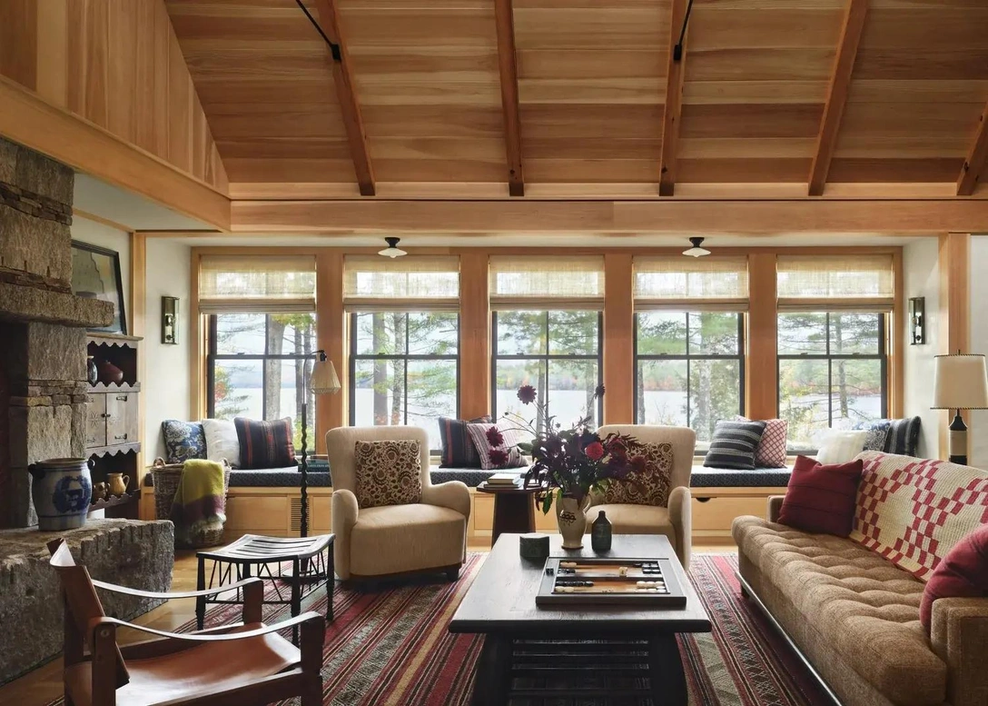 В интерьере много дерева, к которому добавили насыщенные оттенки синего, красного и охры, придавшие пространству глубины. У хозяев не было лишней мебели, которую они были готовы перевезти в Нью-Гэмпшир, поэтому почти все пришлось подбирать с нуля. Команда стремилась создать гармоничный микс старого и нового. «Диваны мы, как правило, выбираем современные, а аксессуары и такие вещи, как кресла, обычно винтажные. Хотелось, чтобы все использовалось в реальной жизни, а не просто создавало ощущение».