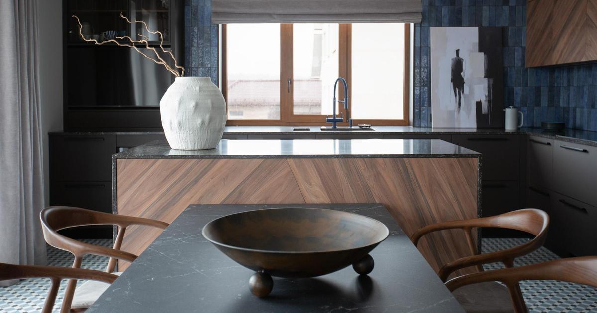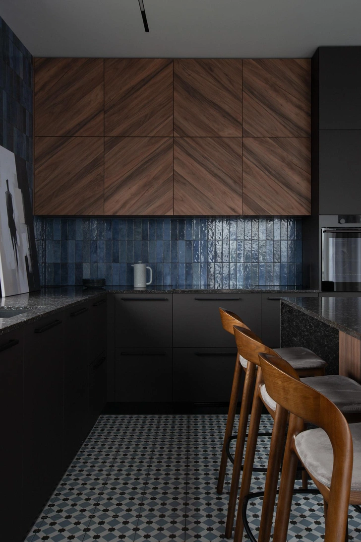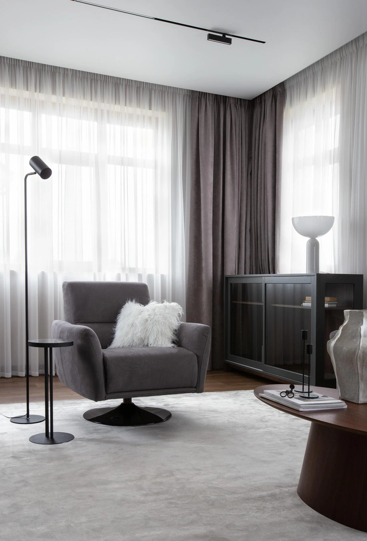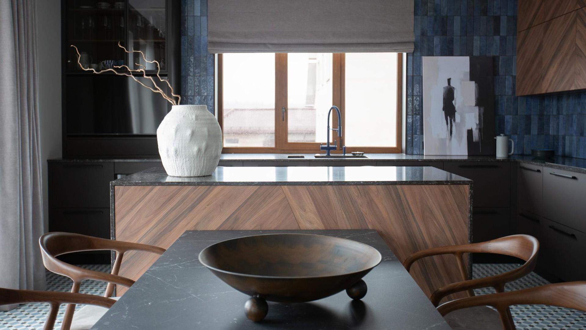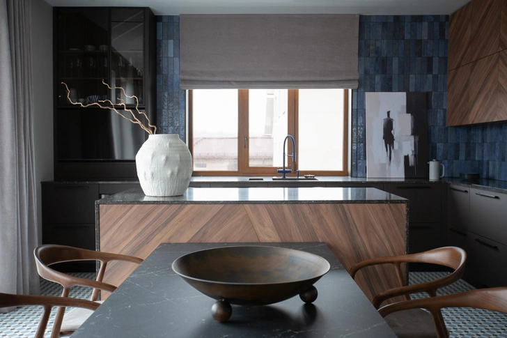 В интерьере сочетаются матовый металл, натуральное дерево, плотный текстиль и глубокие оттенки графита, табака, голубого и темно-зеленого. Я сбалансировала пространство контрастами: брутальные формы смягчает сложная палитра, тактильные поверхности и выверенные пропорции. Вместо прямых ассоциаций с лофтом — нюансная работа с фактурами. Проект во многом построен на индивидуальных решениях, поэтому выделить самый интересный предмет сложно — все друг с другом связаны.