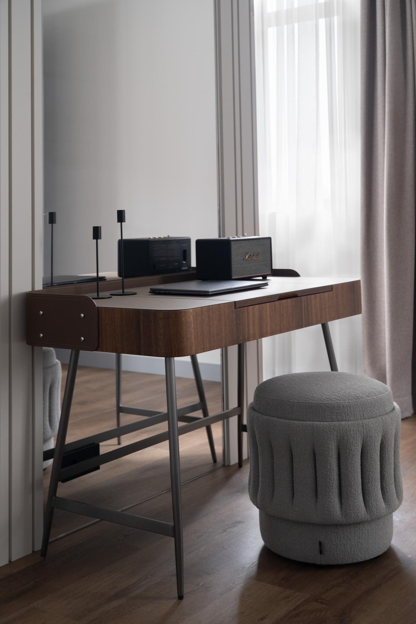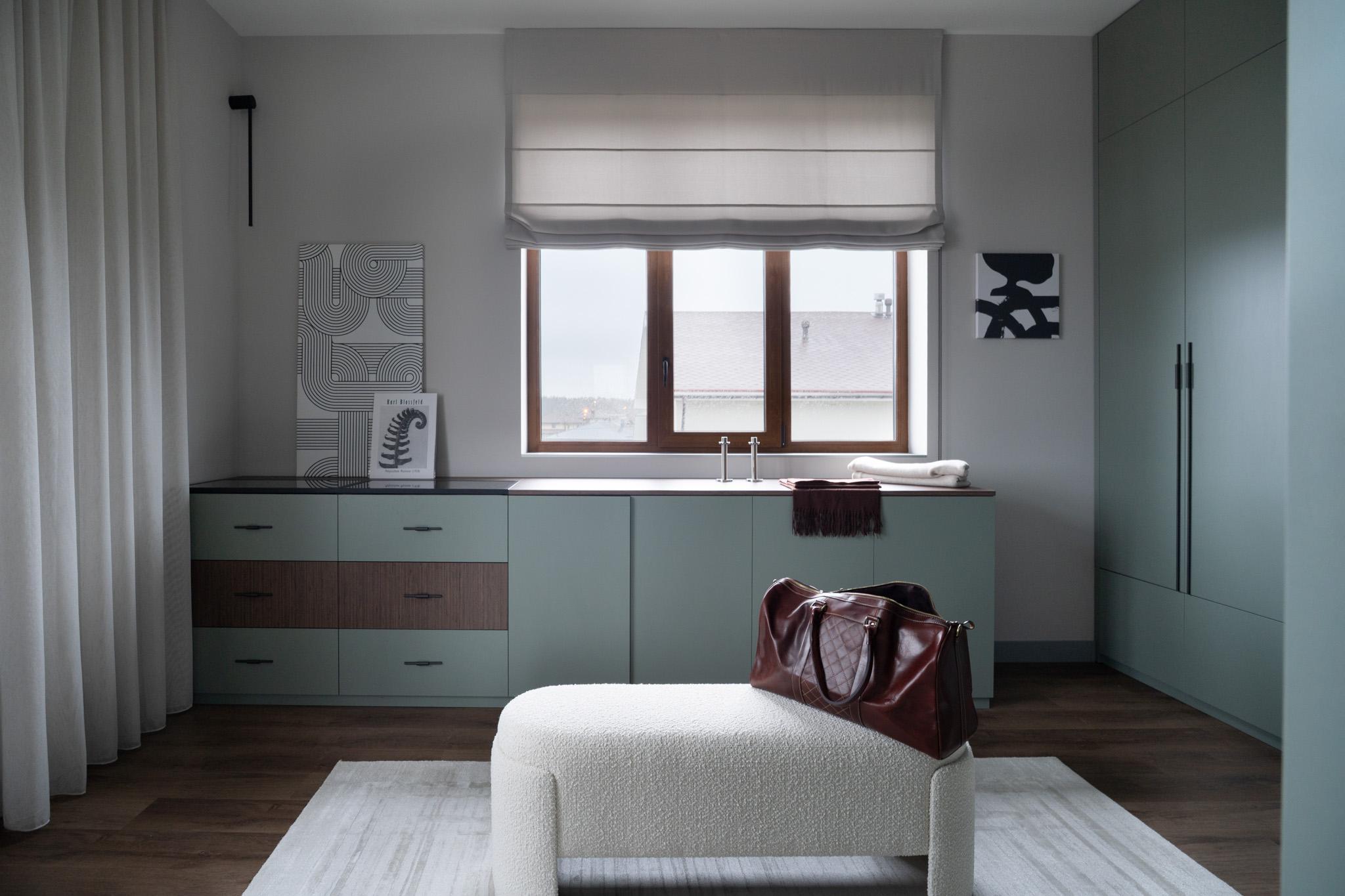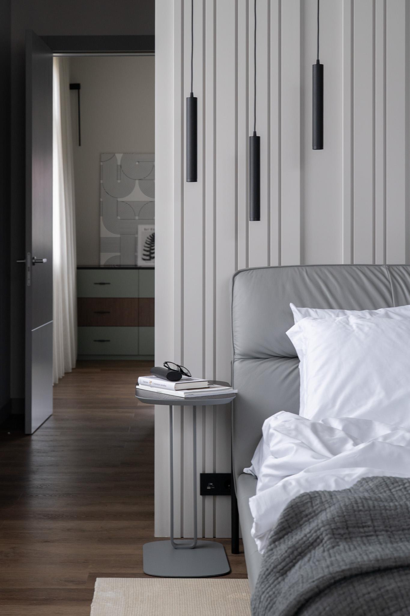 В спальне и гардеробной важно было найти баланс между легкостью и брутальностью. Кровать, прикроватные тумбы и металлические элементы выглядят лаконично, деликатно, но с характером, поддерживают атмосферу сдержанного лофта.