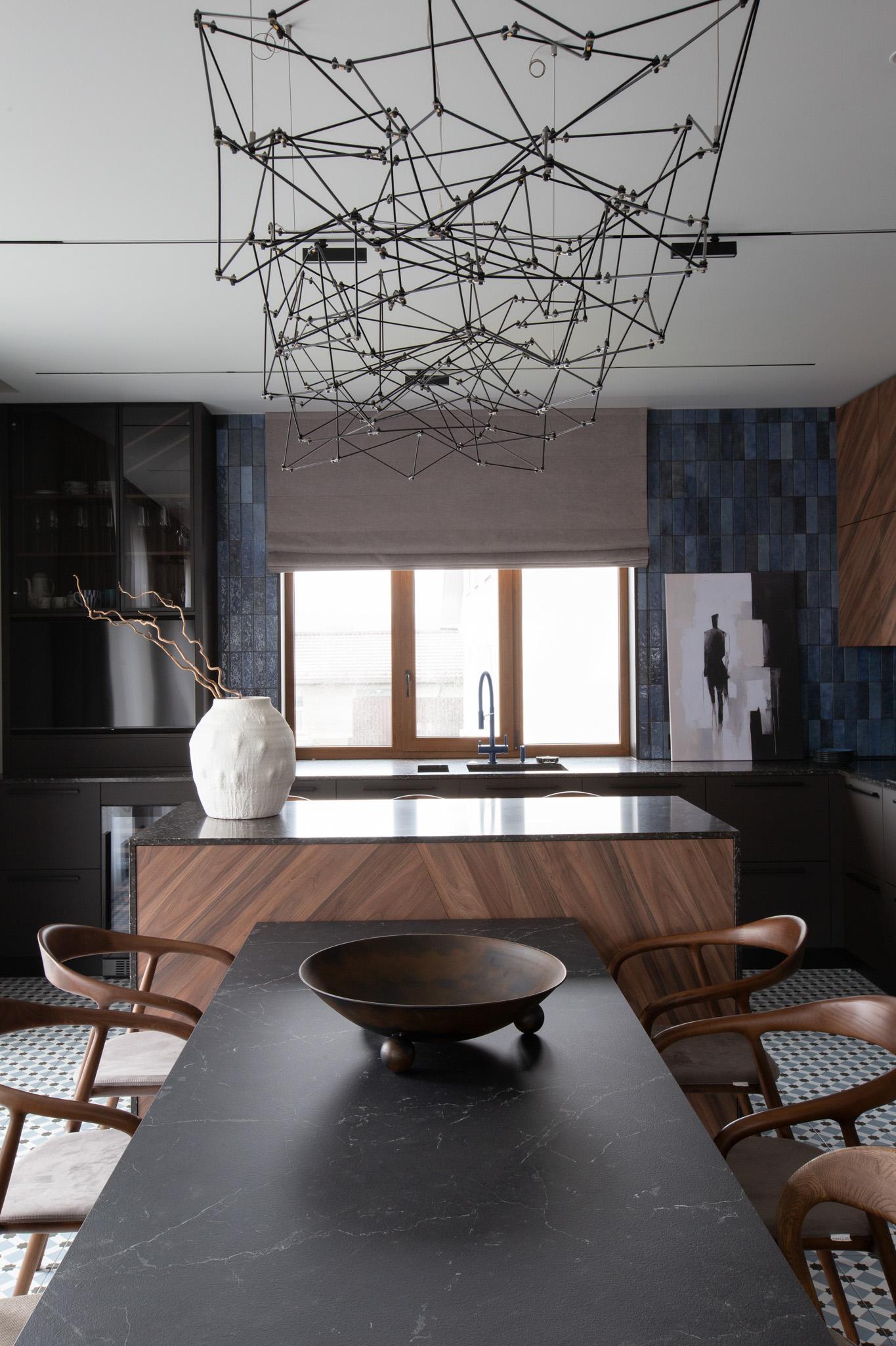 Интерьер получился целостным, но в каждой зоне есть свои акценты. Главной стала, конечно, просторная кухня-гостиная. Особое внимание уделили кухонному острову со встроенным хранением и столешницей из акрила. У нее выразительный рисунок в оттенке глубокой черной ночи с голубыми вкраплениями. Обеденную зону мы выделили светильником от Bezhko — он идеально вписывается в интерьер, одновременно графичный, объемный и воздушный. Теперь здесь любят собираться гости: заказчик потом говорил, что их так много, что «от визитов уже никак не отвертеться», и в этом он с юмором винит дизайнера.