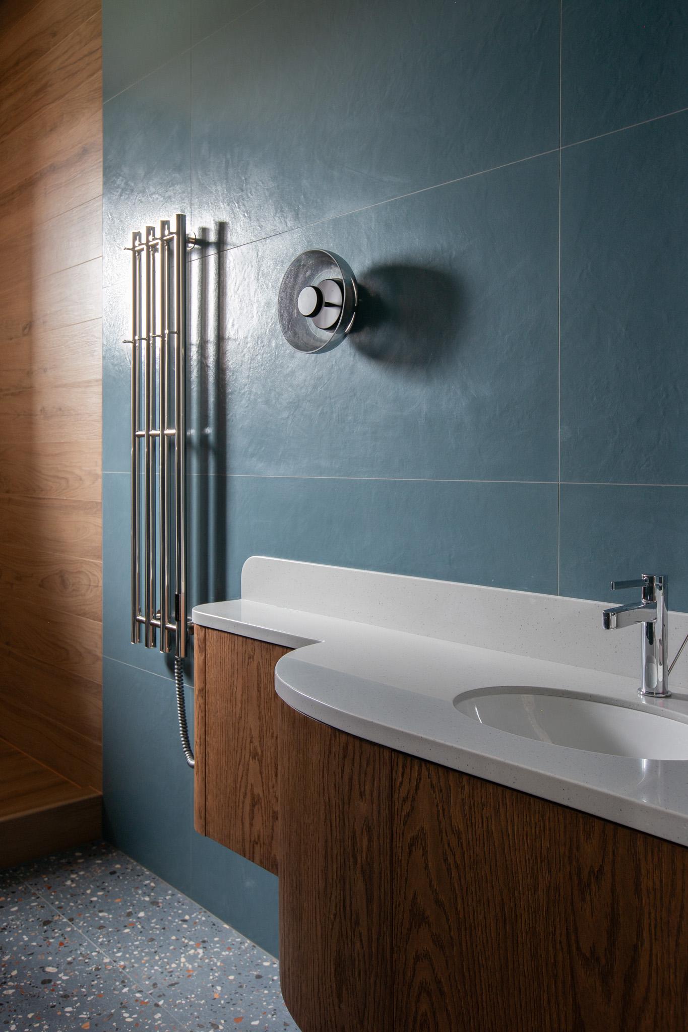 В ванных комнатах интерьер такой же лаконичный и сдержанный, но выразительные элементы здесь есть — это тумбы, они выполнены на заказ. Такие формы, кроме того что смотрятся необычно, помогли деликатно скорректировать неточности в технических планах.