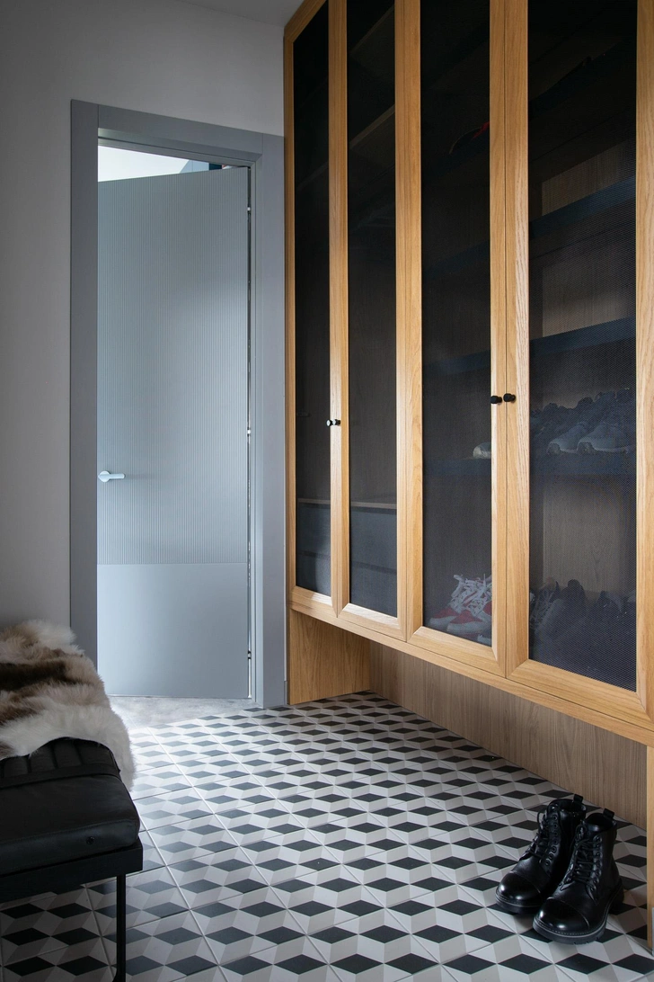 Отдельного внимания заслуживает шкаф в прихожей с фасадами из натурального дерева и металлической сетки — это не только выразительный визуальный прием, но и функциональное решение: благодаря этому вещи могут «дышать».