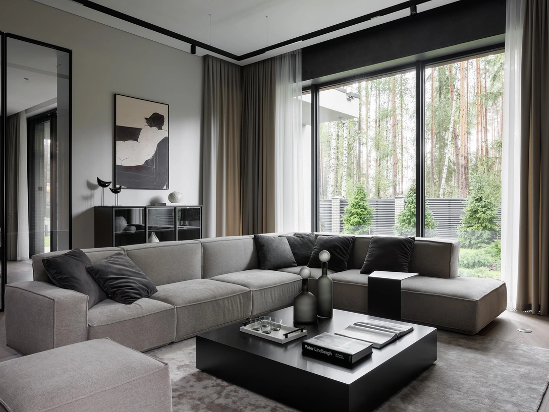 В доме использована та же цветовая гамма, что помогло создать связь между экстерьером и интерьером. Большая часть стен выкрашена в фоновый светло-серый оттенок, а мебель черная, выполненная в матовом дереве.