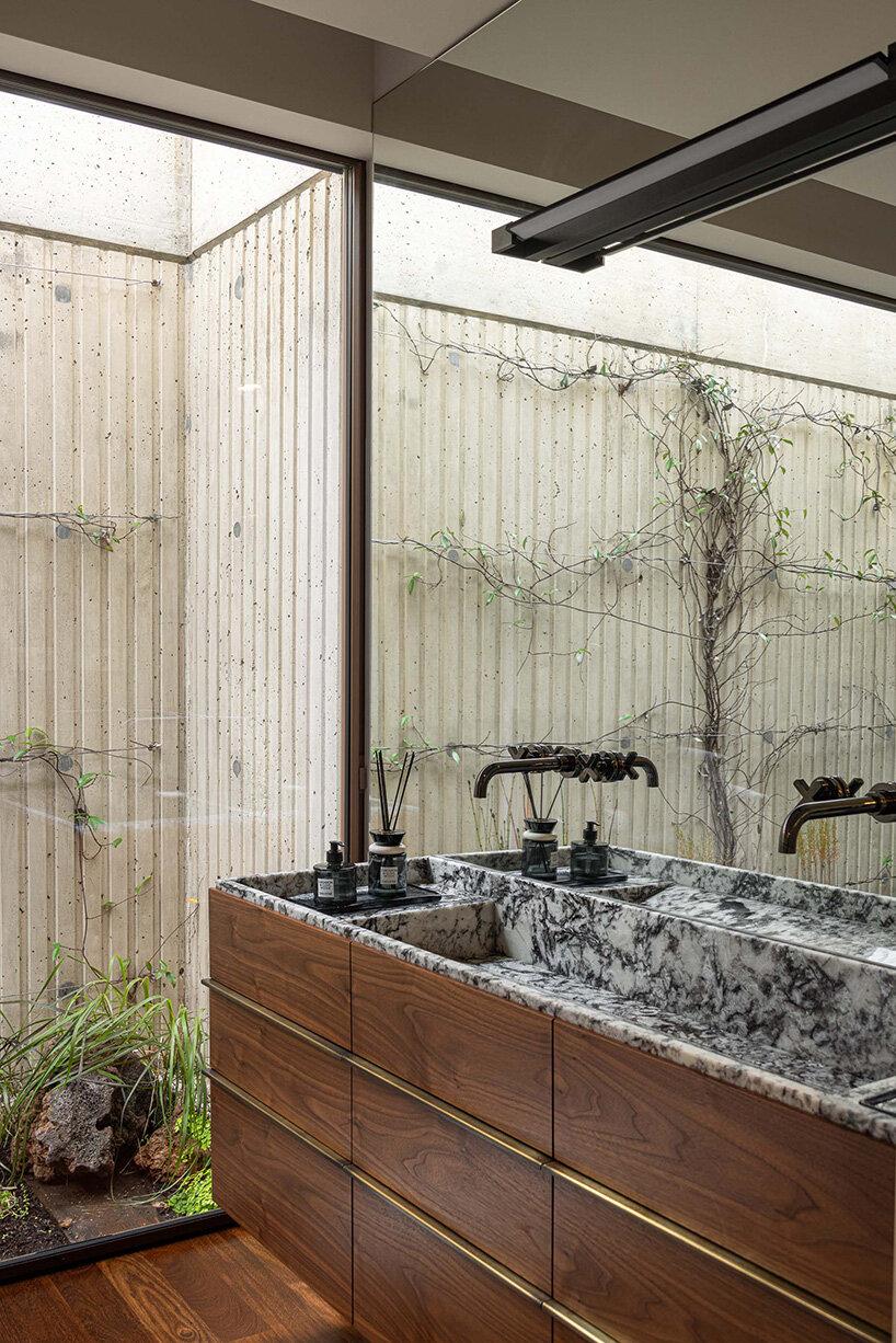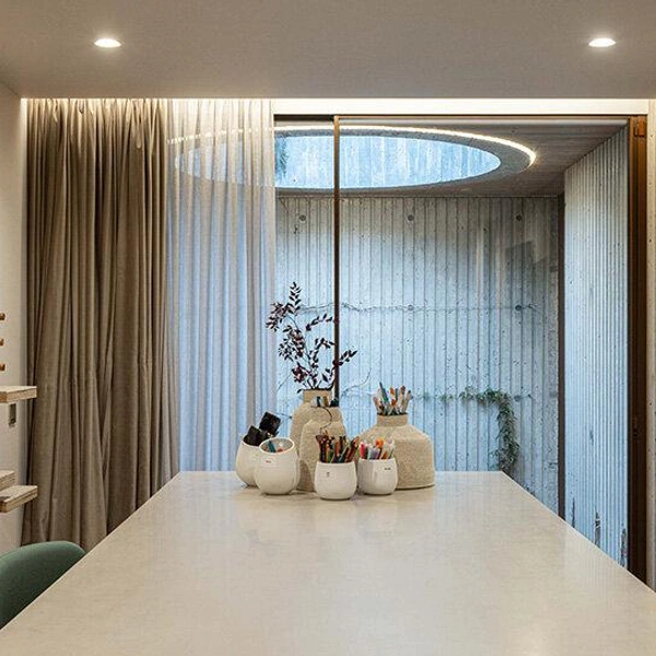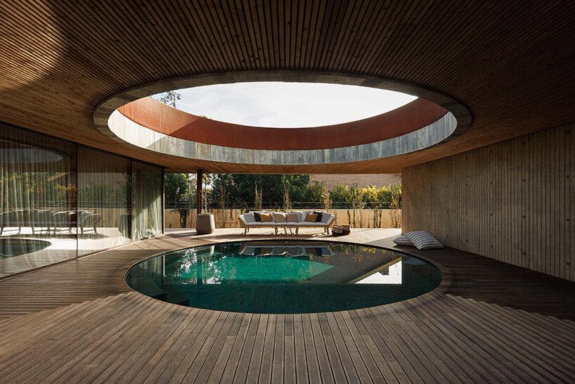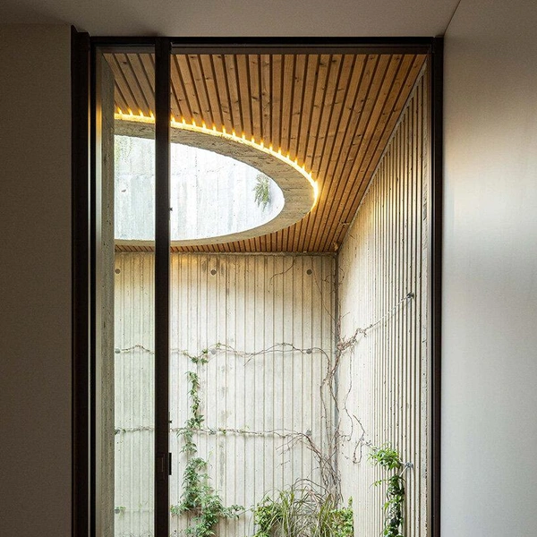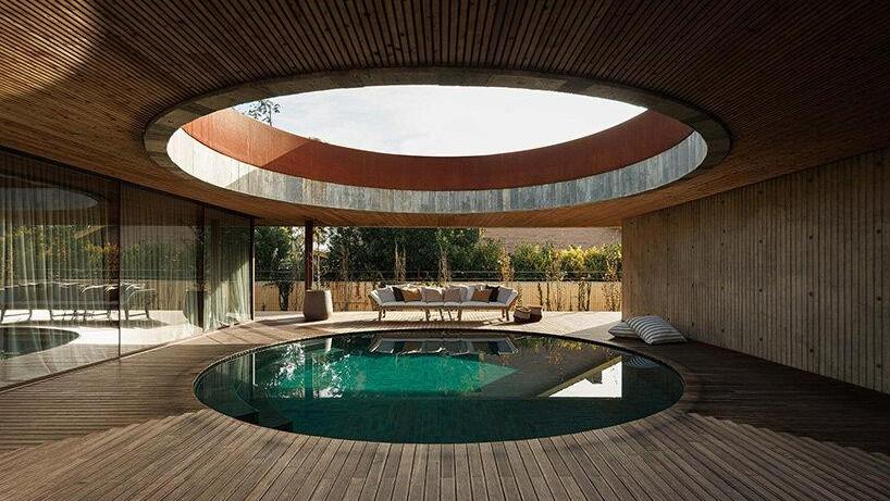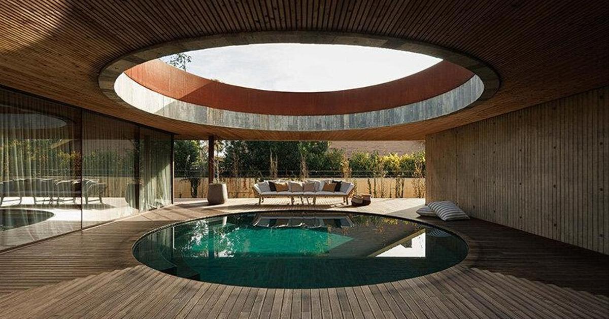 Сердце дома — круглый двор, в центре которого расположен бассейн. Над ним в крыше прорезано круглое отверстие, через которое видно небо. Вода отражает небесный свод, а свет проникает в окружающие комнаты. В течение дня солнце движется, и тени меняются, создавая разную атмосферу.