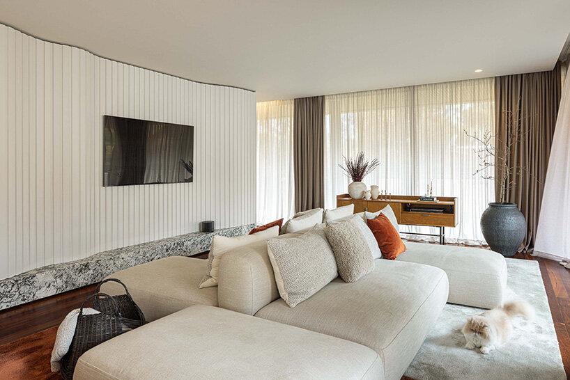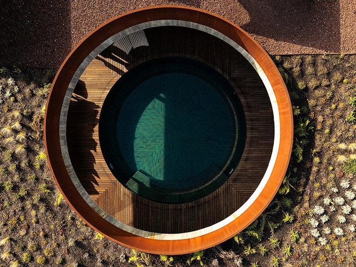 Бассейн работает не только как элемент дизайна, но и как естественный климат-контроль: вода смягчает температуру, увлажняет воздух и создает ощущение прохлады в жаркие дни.