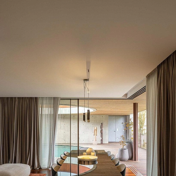 Все помещения расположены вокруг центрального двора. Комнаты выходят к бассейну стеклянными стенами, так что из любой точки виден центр дома. При этом сохраняется приватность — за счет продуманной геометрии.