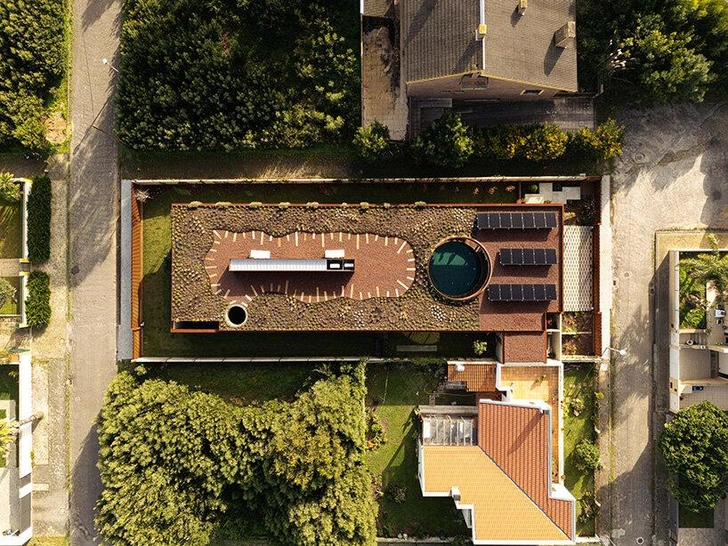 Крыша зеленая — на ней высажены растения, которые визуально соединяют дом с ландшафтом. Сверху здание почти не видно: оно словно встроено в землю.