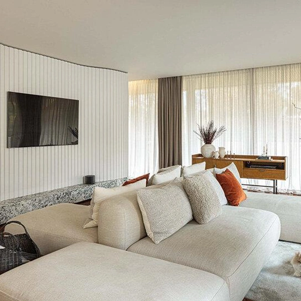 Фасады дома облицованы бетоном, кортеновской сталью, стеклом и натуральным деревом. Каждый материал выбран не только за внешний вид, но и за долговечность — дом стоит на открытой местности, где сильные ветры с океана и повышенная влажность быстро старят обычные покрытия.