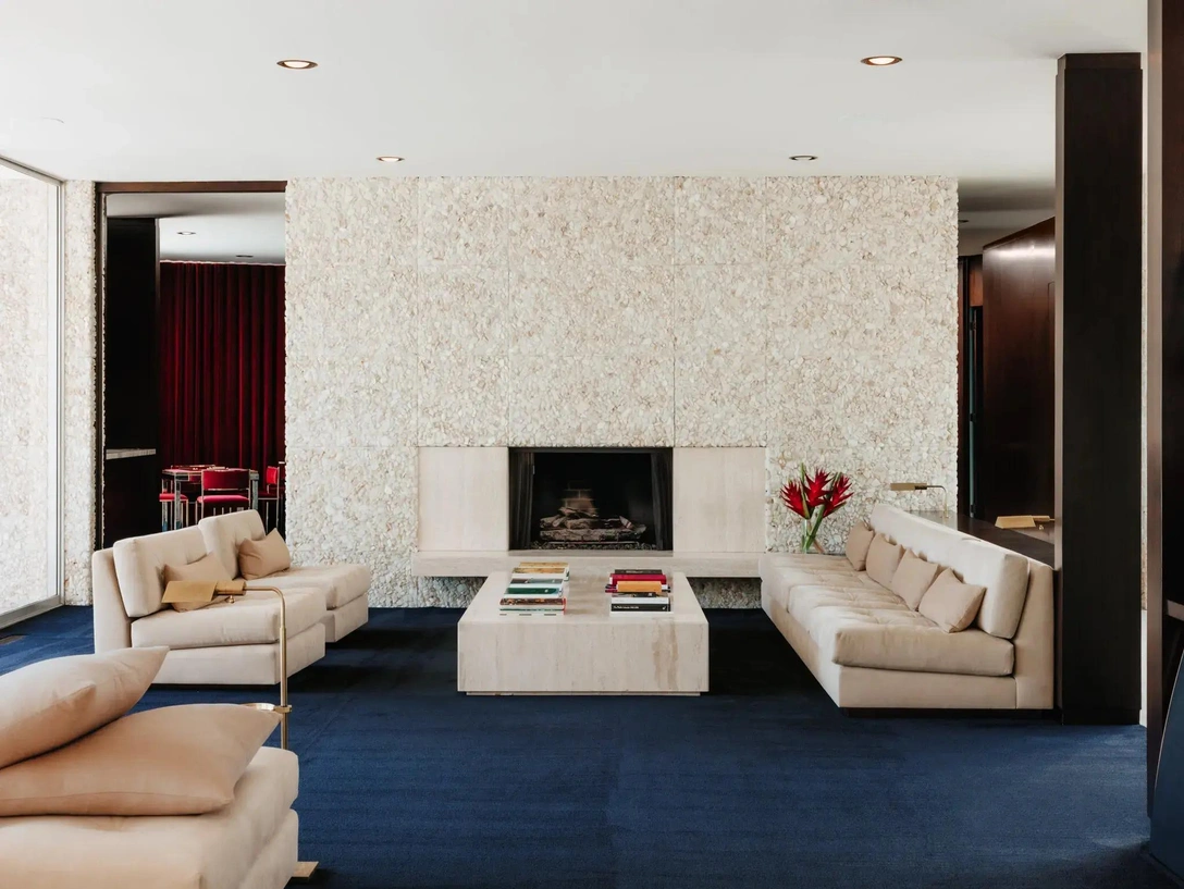 Дом ориентирован вокруг гостиной, ограниченной с одного конца стеной с камином, которую в 1950-х годах покрыли кусками белого кварца. Дизайнер заказал прямоугольный журнальный столик, отделанный светлым травертином и окружен низкими диванами, обитыми замшей цвета слоновой кости.