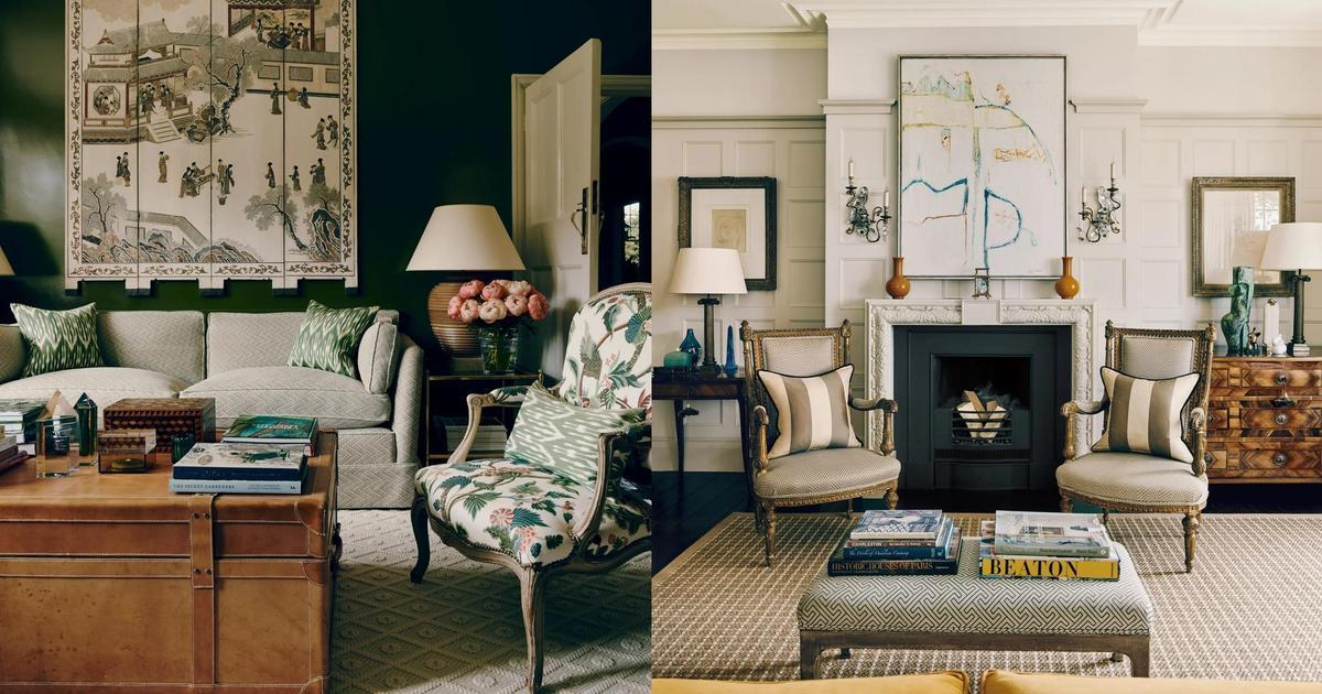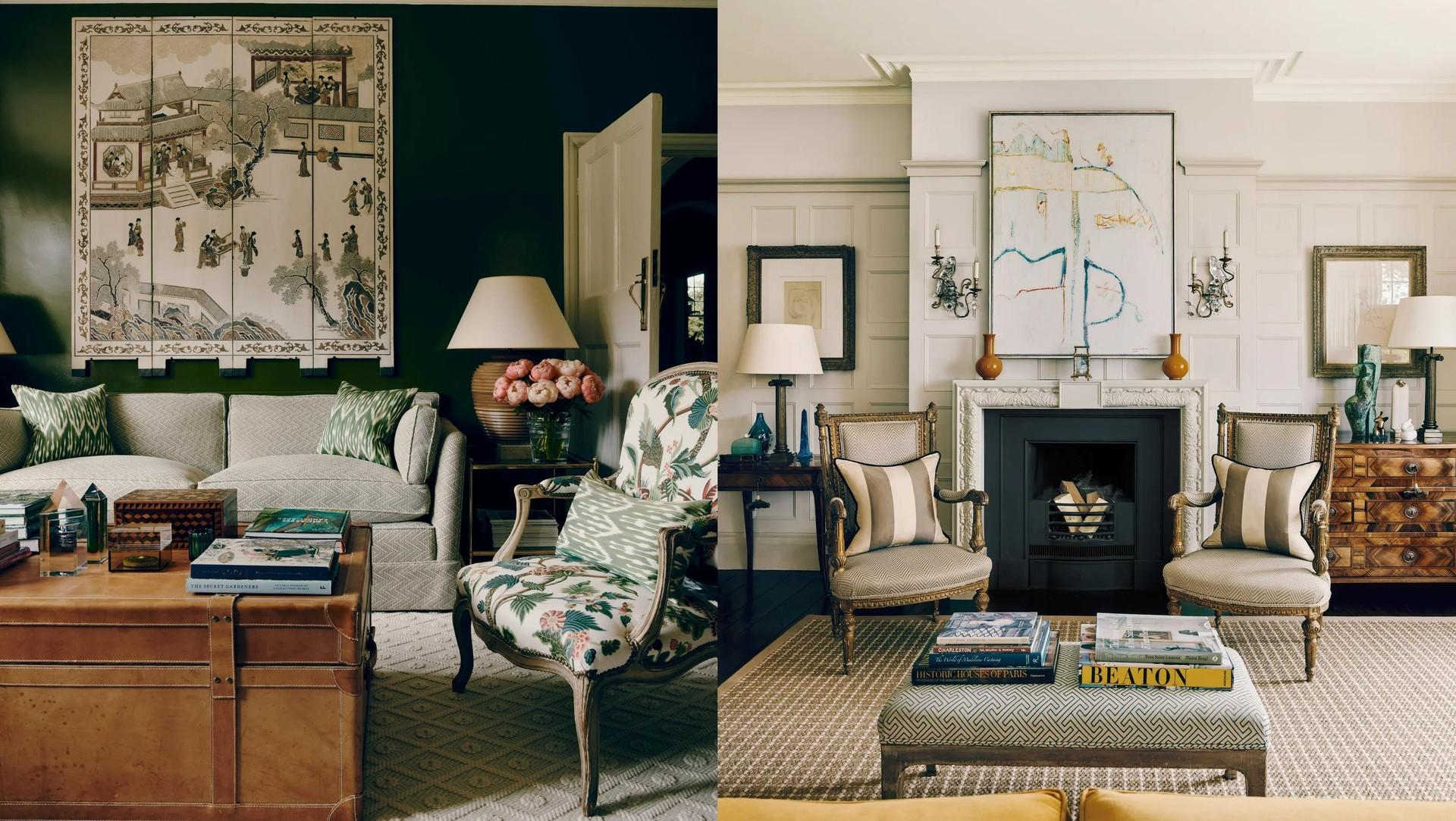 Деревянные панели в гостиной и библиотеке Мур восстановил в стиле, соответствующем эпохе. У камина — антикварные кресла. Над камином — работа Рафаэля Тур Косты (Rafael Tur Costa) 1969 года. Библиотека же оформлена в более сдержанных тонах: стены, например, покрашены в теплый оливково-зеленый.