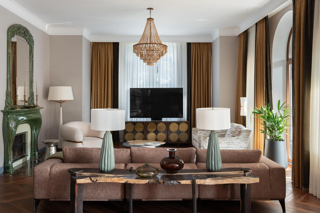 Диван, Eichholtz. Столы, Arteriors. Бра, Masiero. Потолочные светильники, Kelly Wearstler.