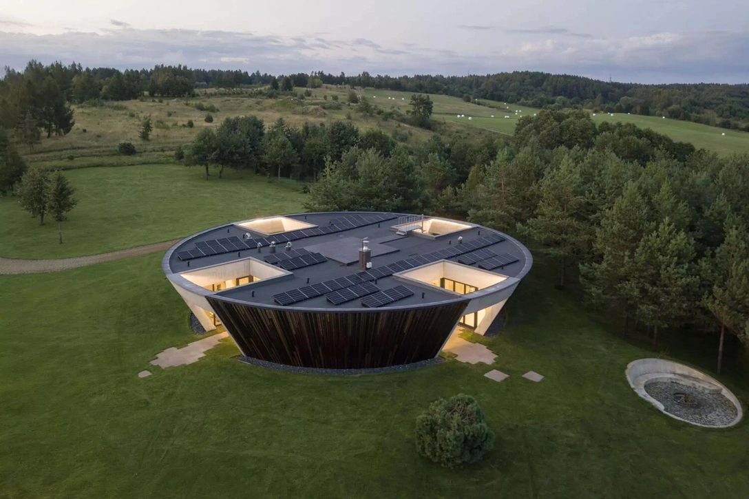 Этот дом на берегу озера спроектировали архитекторы студии YCL — Томас Умбрасас, Айдас Барзда и Таутвидас Вилейкис. Его форма довольно необычна — он не просто круглый: его планировка напоминает знак плюса, и из каждого блока открывается широкая пейзажная панорама. Фасад выполнен из термомодифицированного дерева и бетона.