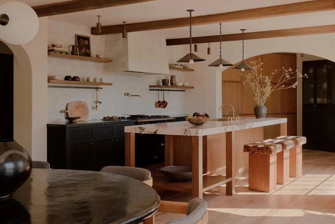 В доме положили пол из восстановленной древесины, заново оштукатурили стены, старые балки покрасили в насыщенный коричневый. Для кухни и ванных комнат выбрали сочетание натурального камня и марокканской плитки.