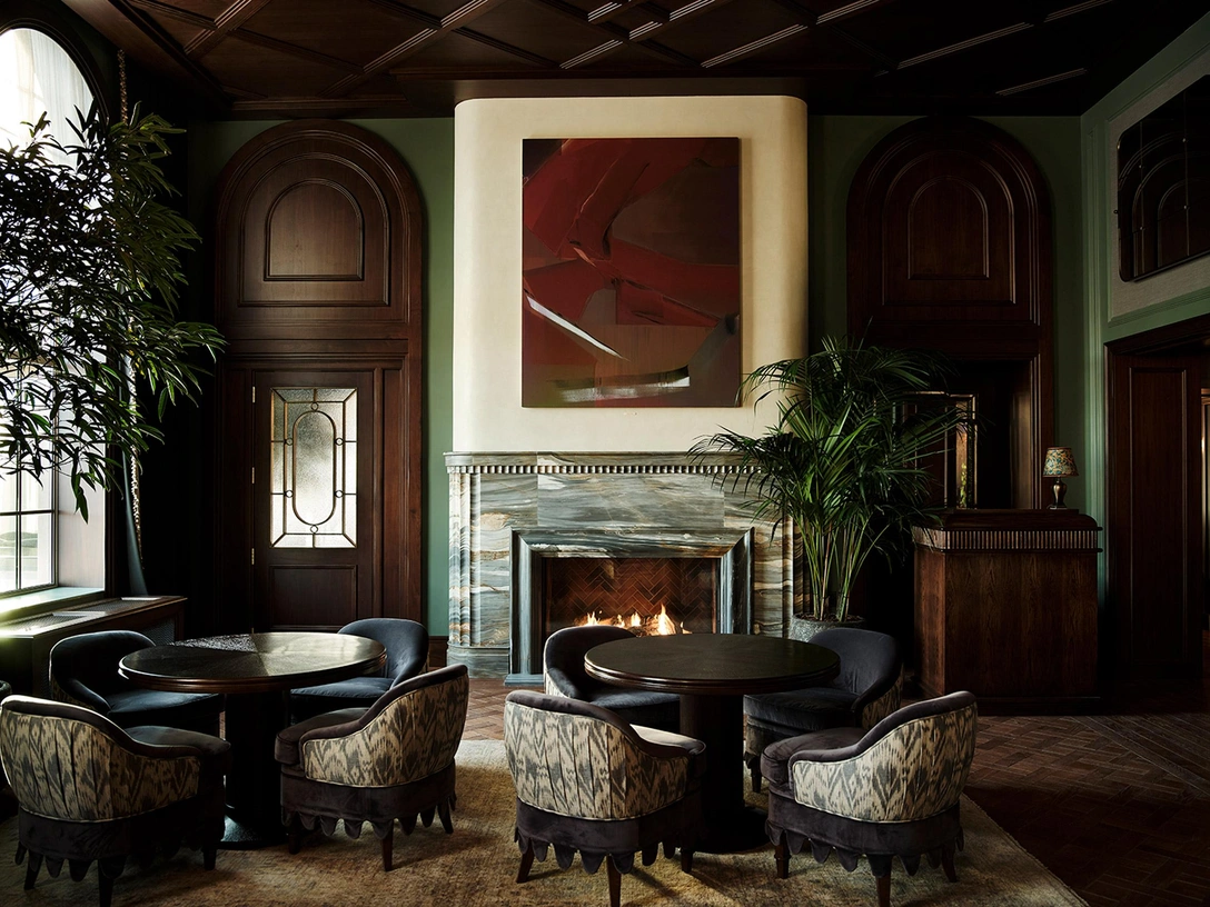 В ресторане с деревянными панелями есть витражные окна, которые отсылают к лондонскому филиалу клуба, а также выполняют функцию ширмы. «Сразу за витражами находится фронтон кирпичного здания. Мы не хотели, чтобы он был первым, что бросается в глаза при входе в помещение», — рассказали дизайнеры.