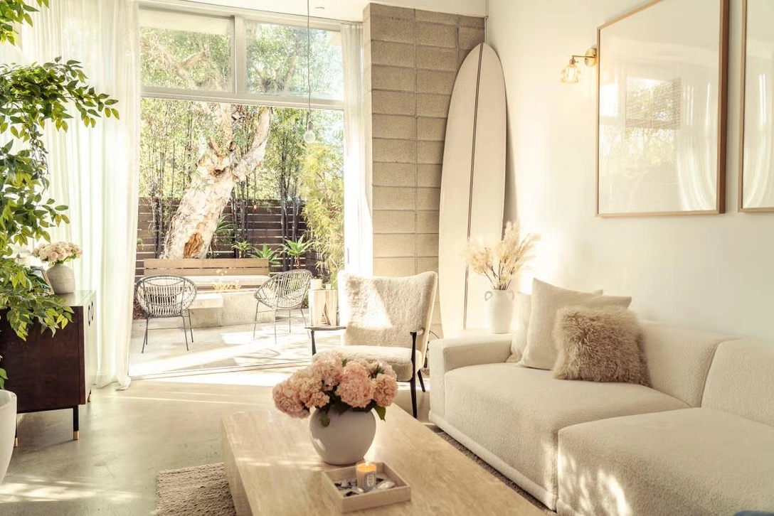 В качестве основы выбрана нейтральная палитра, дополненная мягкими цветовыми и фактурными акцентами. Стилистически в интерьере есть что-то от mid-century modern, что-то от сканди, что-то от тихой роскоши. Рабочий график Молли непредсказуем и хаотичен, поэтому она особенно ценит спокойствие и домашний уют: здесь много натуральных материалов и нежного текстиля.