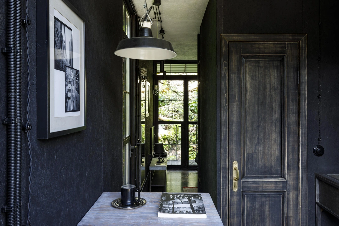 Материалы я использовал самые простые: ОСБ-плиту и фанеру. Все лаконично. Черное и белое. Никаких компромиссов. Черный цвет тут призван «убрать» стены, переместив акцент на природу вокруг. В итоге создается впечатление, что ты погружен во внешний мир. Пение птиц, шелестение листвы, капли дождя… Ты зависаешь в окружении этих звуков. И, конечно, вид из «гостиной» на горный хребет Аибга, великолепен своим величием.