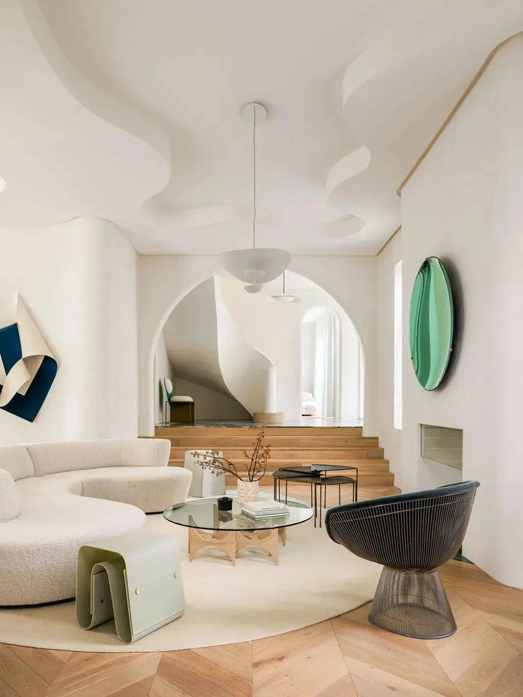 Так в доме появились волны на потолке, изгибающиеся стены, арки и винтовая лестница-лента. «Мы хотели создать плавный вертикальный элемент, который привлечет внимание сразу от входа», — объясняет дизайнер.