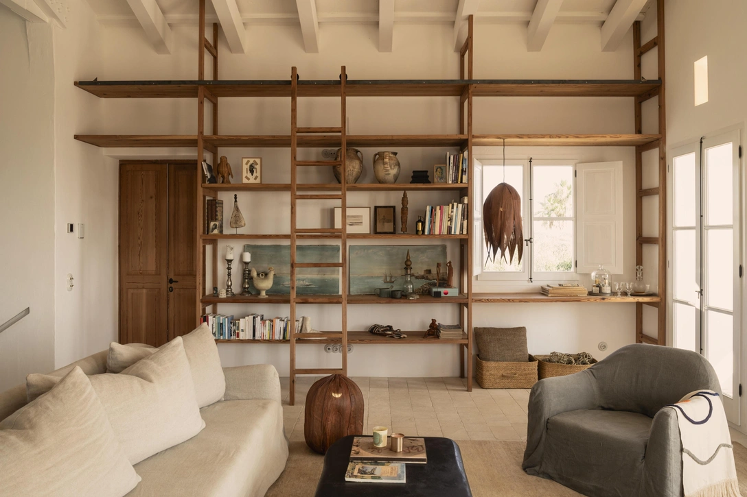 Мебель в доме достаточно простая. В гостиной разместился диван, кресло и книжный стеллаж с передвижной лестницей, в кухне — большой деревянными стол с двумя скамейками, в спальнях — кровати, дополненные мягким текстилем из натуральных тканей. Особое внимание привлекают светильники от Let’s Pause. Сделанные вручную из экологичных материалов, таких как растительная кожа, пальмовые листья, корень оливы, они привносят разнообразие в лаконичный интерьер и усиливают связь с природой.
