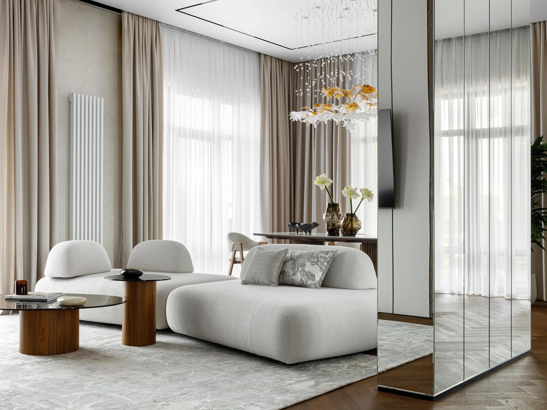 Интерьер получился спокойным и умиротворяющим, но при этом совсем не скучным. Самым необычным, интересным предметом в этом интерьере стала инсталляция над обеденным столом с золотыми лепестками — в ней почти 100 элементов! Когда она отражается в зеркальной колонне, есть ощущение, что находишься в калейдоскопе. Весь декор будто специально создавался для этого проекта!