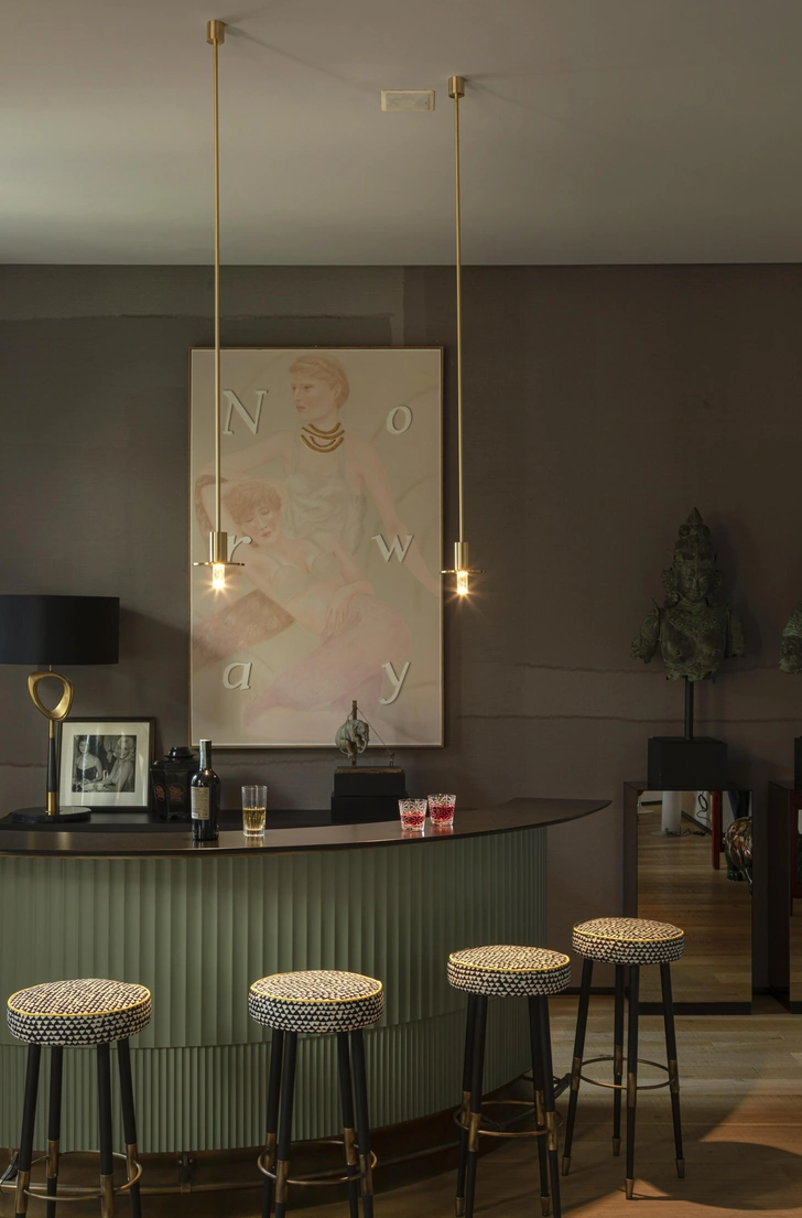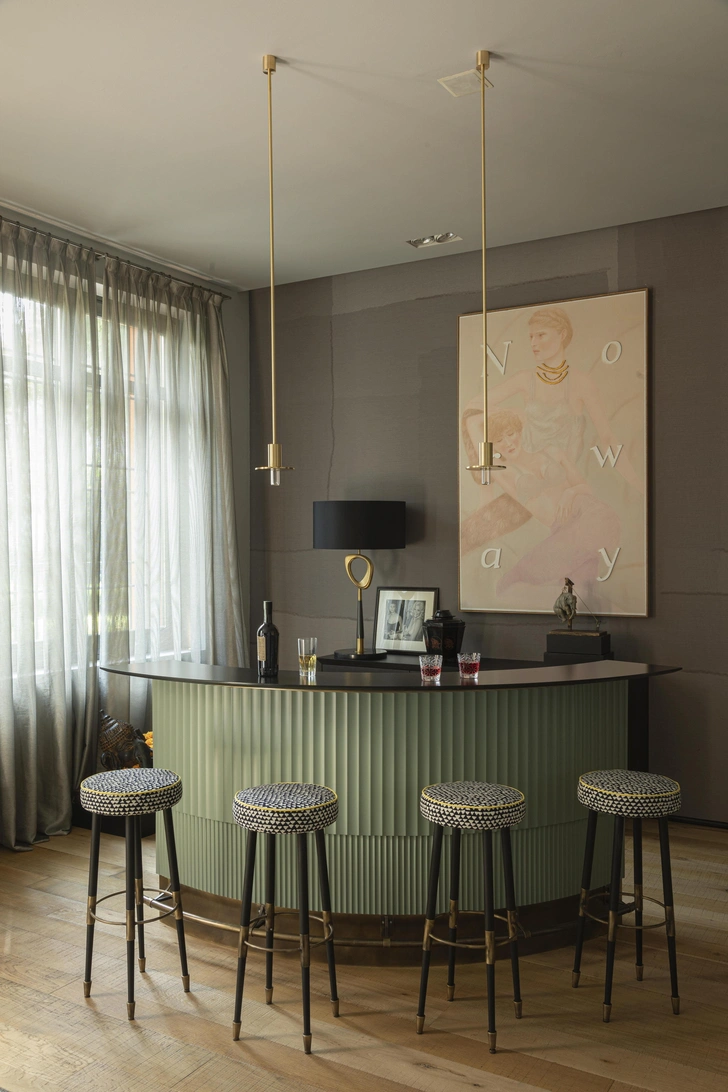 Обои, табуреты и барная стойка изготовлены по дизайну Pelizzari Studio. Настольная лампа с черным абажуром, Eichholtz.