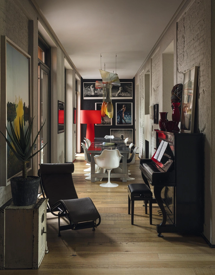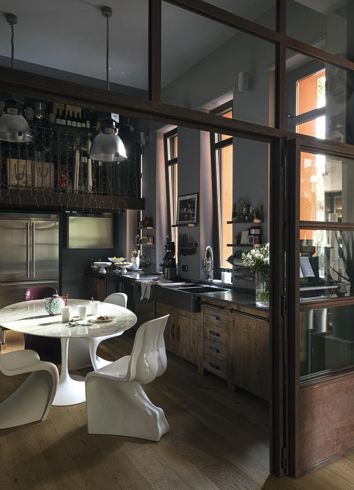 За массивным металлическим порталом, который разделяет зону готовки и гостиную, расположена удобная кухня в индустриальном стиле. Мраморный стол Tulip от Knoll и группа кресел Panton Vitra — легендарной модели родом из 1960-х — контрастируют с графикой темных рам. Пространство дробится, но не теряет целостности: прозрачные перегородки позволяют свету свободно циркулировать, сохраняя ощущение воздушности. Паркет из осветленной лиственницы подчеркивает цветовую гамму дома, создавая плавные переходы между зонами.