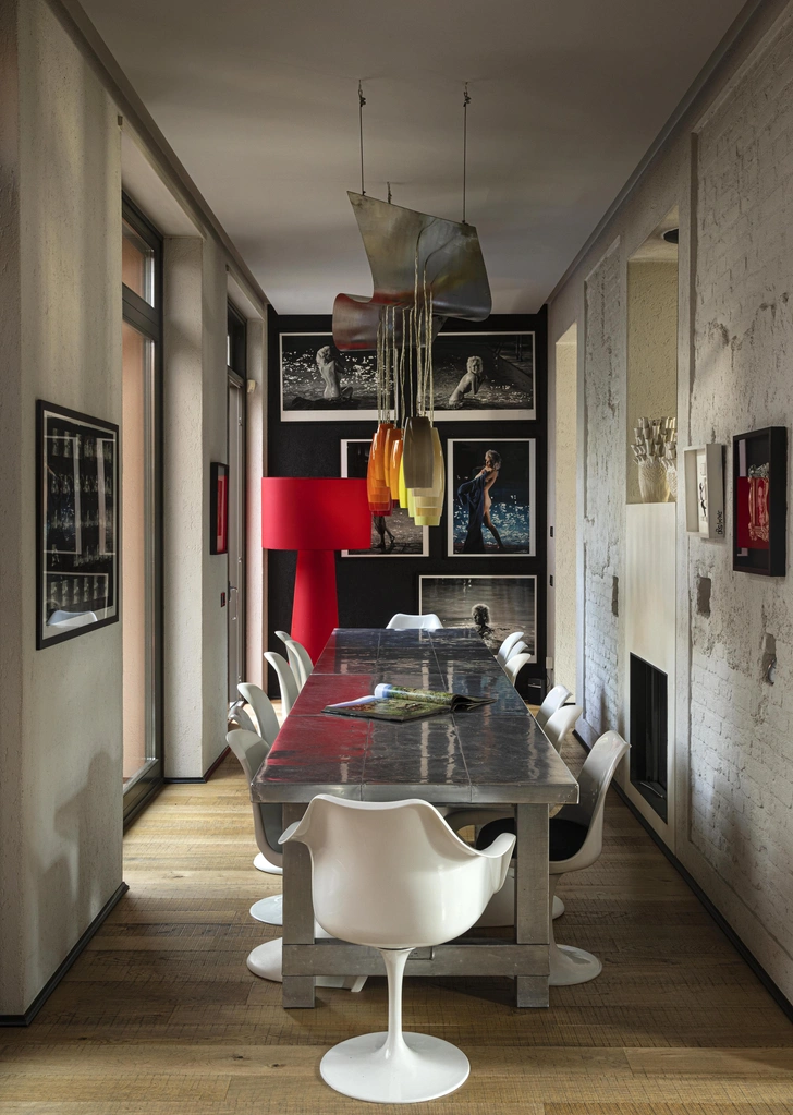В кухне обеденная группа собрана из стола Tulip от Knoll, стульев Pantone Cahair Вернера Пантона, Vitra, и стула Фабио Новембре Him&Her, Casamania