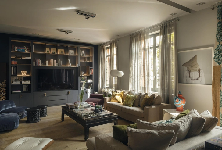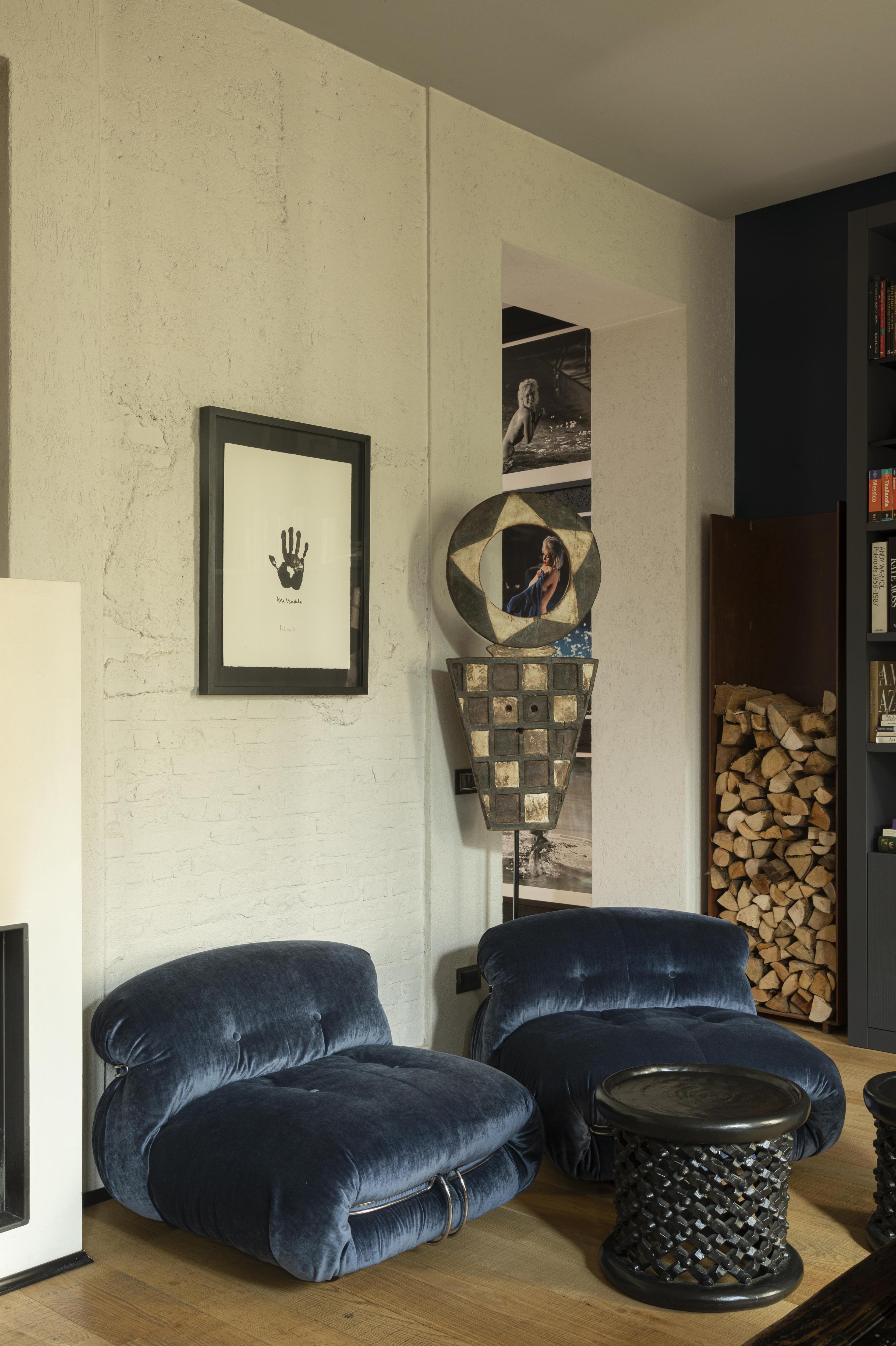 Синие кресла Soriana, Cassina. Серый стеллаж и диваны изготовлены по дизайну Pelizzari Studio. Декоративные подушки, Dedar